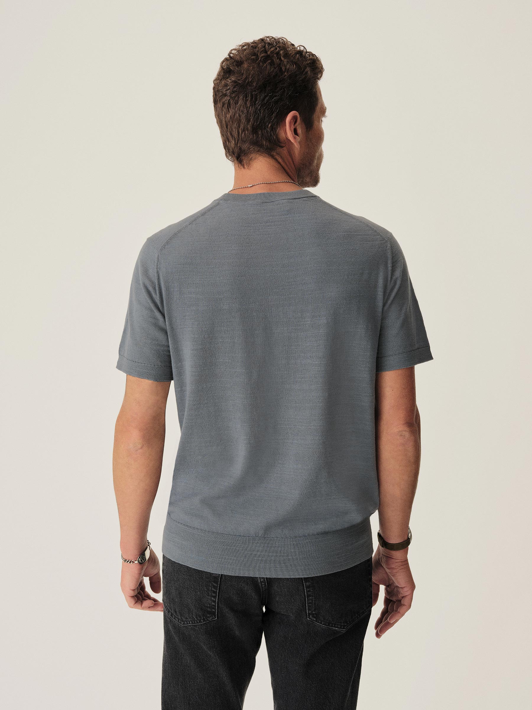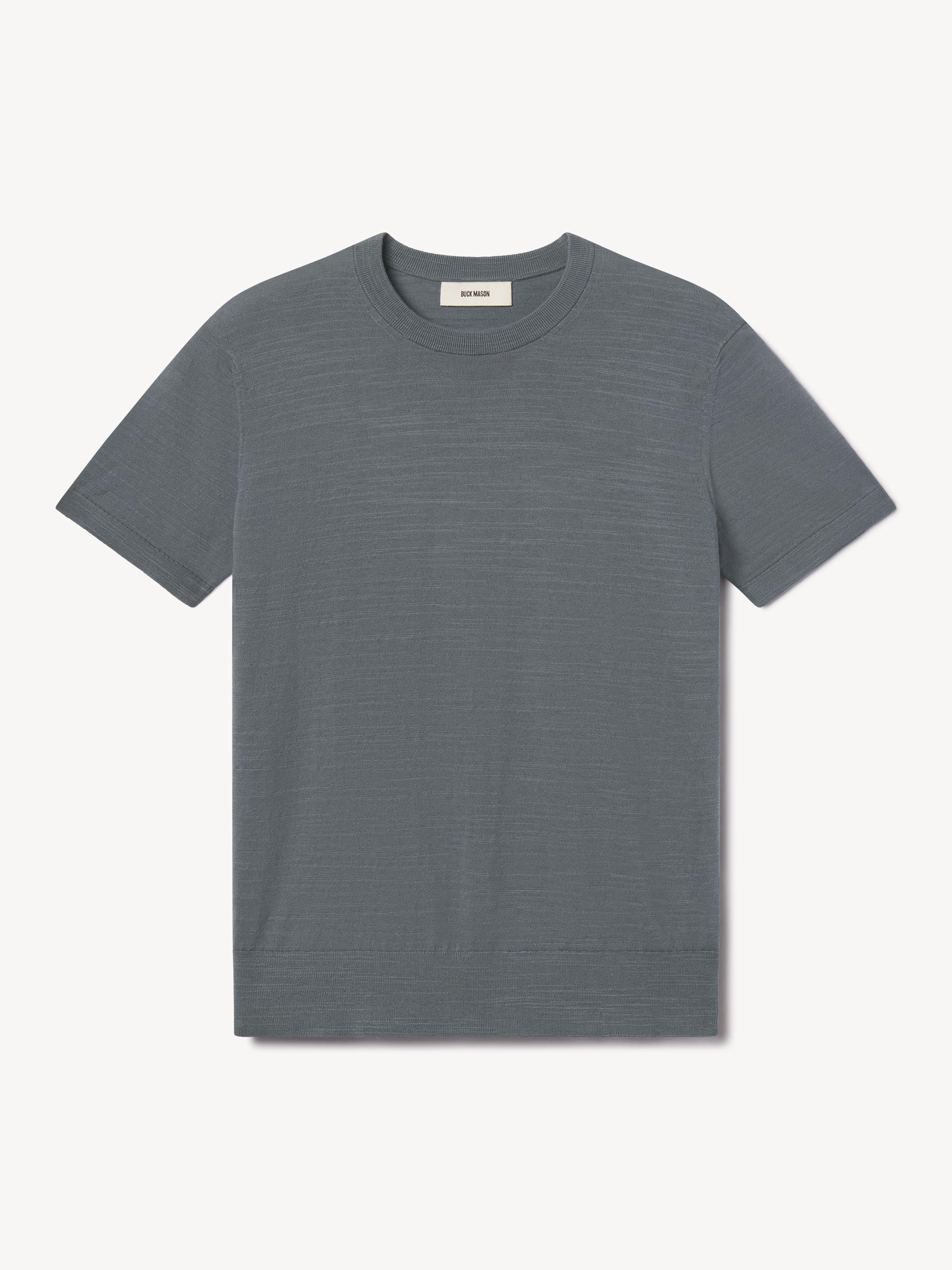 Classic fit short sleeve sweater tee with a straight hem. Yarn-dyed 16 gauge cotton jersey features light slub texture. Features double layer 1×1 ribbing at the collar and rib finishing at the cuffs and hem. Constructed with hand-linked seams for improved durability.