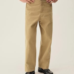 Inspired by 1960s military-issued chinos, an authentic period silhouette with a high rise, full top block, and a full leg. Cut from sulfur-dyed Japanese twill and constructed with busted seaming at the back rise, inseams, and outseams, along with tunnel belt loops and single-welt back pockets. Finished with corozo buttons, a Talon 42 zip, and a zip fly Stonewashed for a lived-in look and feel.