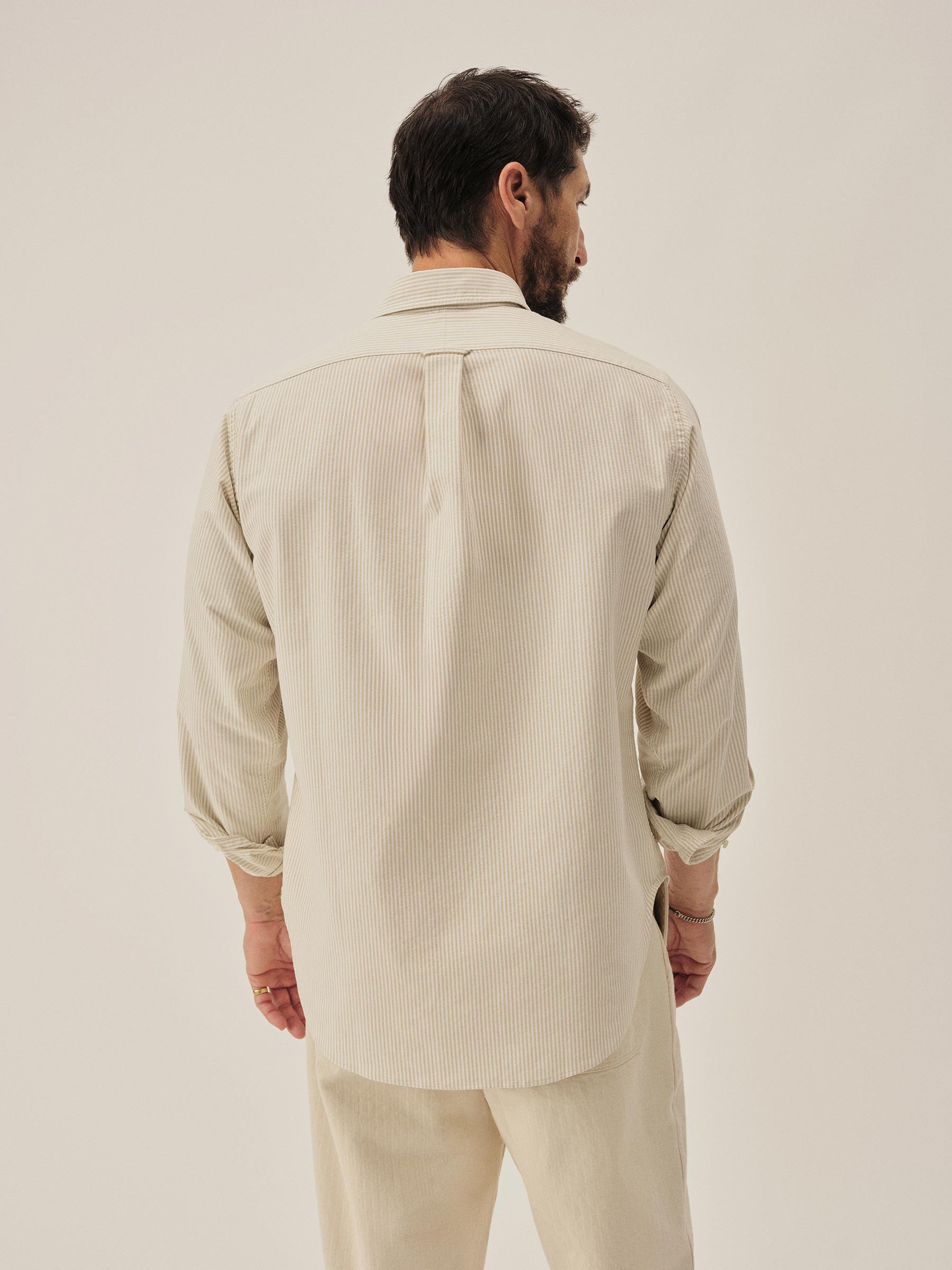 The Big Oxford is a subtle nod to vintage Ivy League tailoring with a gently oversized fit — referencing the proportions of archival American Oxfords. Built from 100% cotton in a 175 GSM heavyweight Oxford weave, using fine combed yarn in the warp and durable carded yarn in the weft. Finished with slightly thicker troca shell buttons.