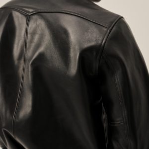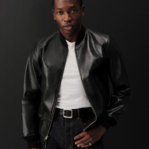 Vintage fit hand-cut bomber jacket in semi-vegetable tanned sheepskin. Two-stage dye process: first, the leather crust is dyed, then a second top dye is applied for a more natural patina. Details include angled zip pockets at the hips and cotton/wool ribbed cuffs and waistband with racking stitch detail. Features Bemberg™ lining. Garment washed, waxed, and hand-burnished for a lived-in feel.