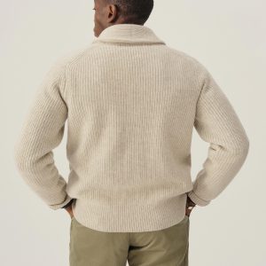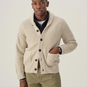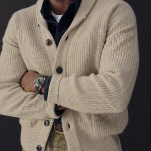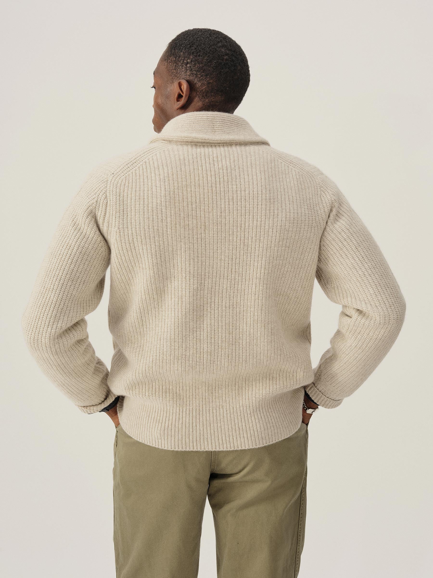 In the mid-1960s, the cardigan was a favorite garment of men seeking a more relaxed jacket alternative. Our ribbed version is crafted from pure 5 gauge cashmere with a heavy weight and finished with horn buttons. With its classic fit and slightly shorter length, it achieves a vintage profile with updated craftsmanship.