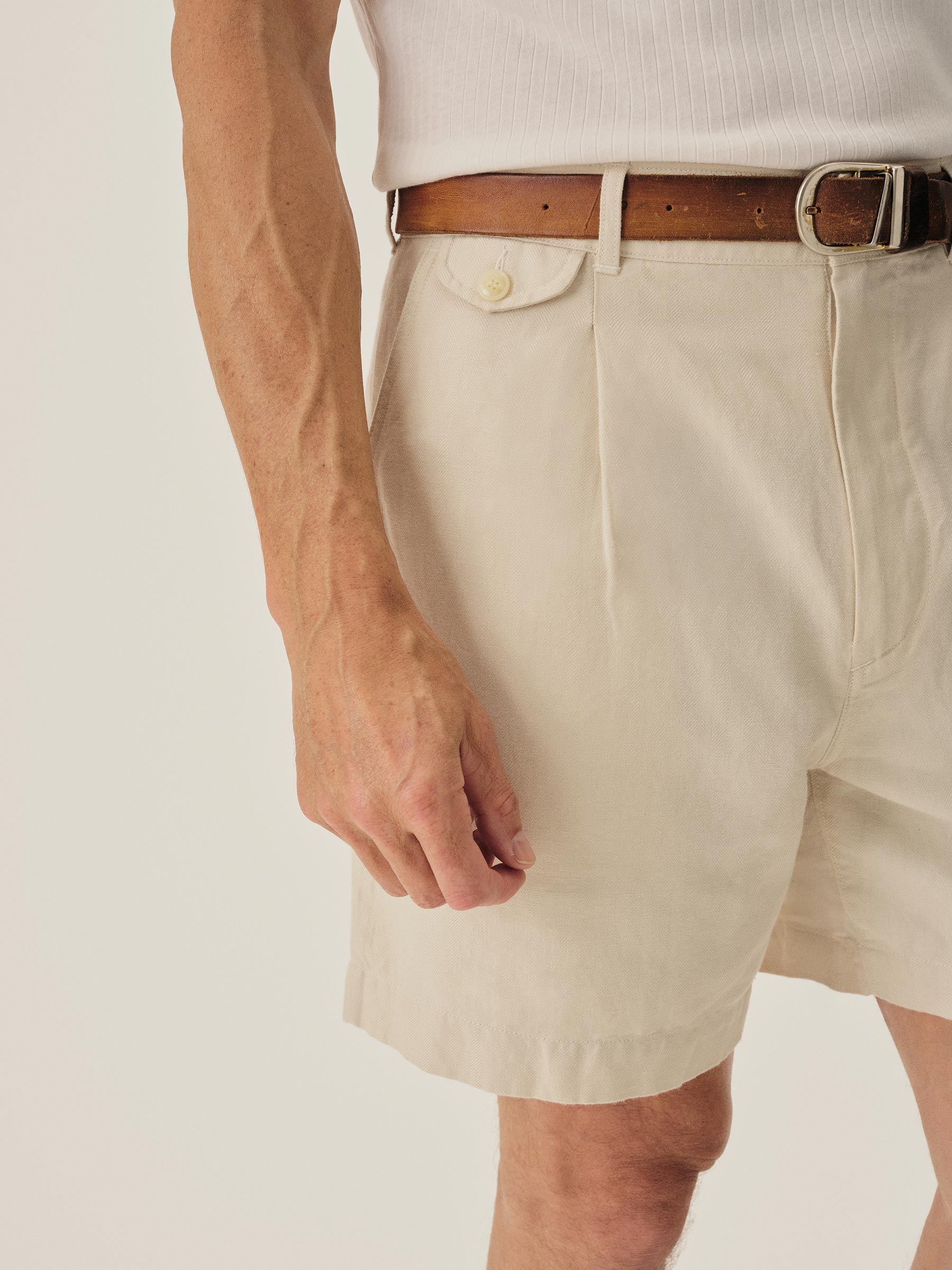 A single pleat short named after the Parisian tailor who helped popularize pleated trousers in the early 20th century. Cut in a relaxed, classic fit with a high rise and 6-inch inseam, the design features a single reverse pleat that adds volume through the thigh for comfort. Made from a 200 GSM cotton-linen herringbone that’s been washed for a soft, broken-in feel from day one. Details include front slash pockets, two welt back pockets, and a buttoned coin pocket.