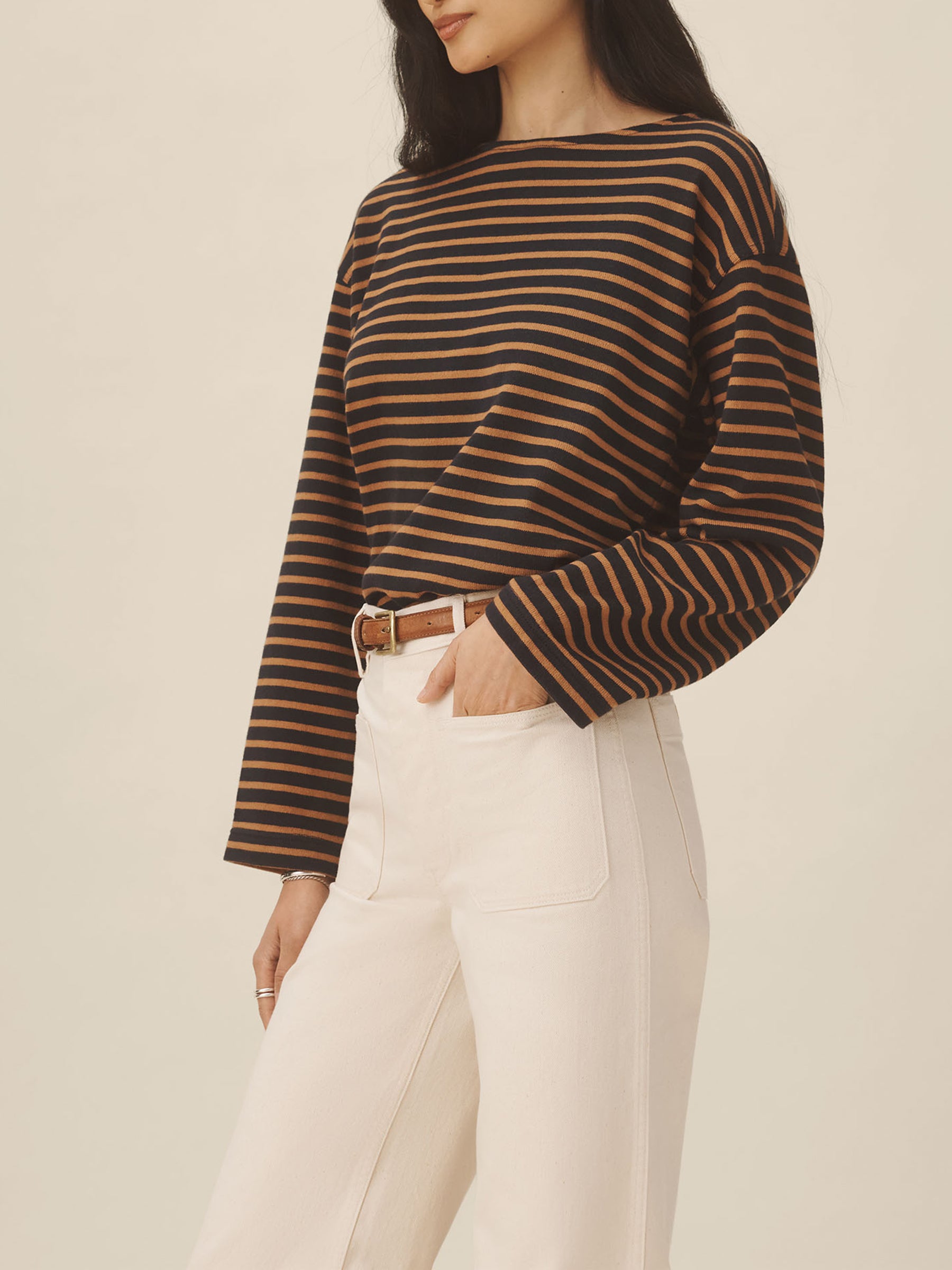 Relaxed long sleeve boatneck tee inspired by the classic French breton shirts. Cut from sturdy, compact 350 GSM cotton. Details include a taped boatneck neckline and side slits at the hem. Constructed with flatlock stitching throughout and double needle coverstitching at the hem. Garment washed for a lived-in feel.
