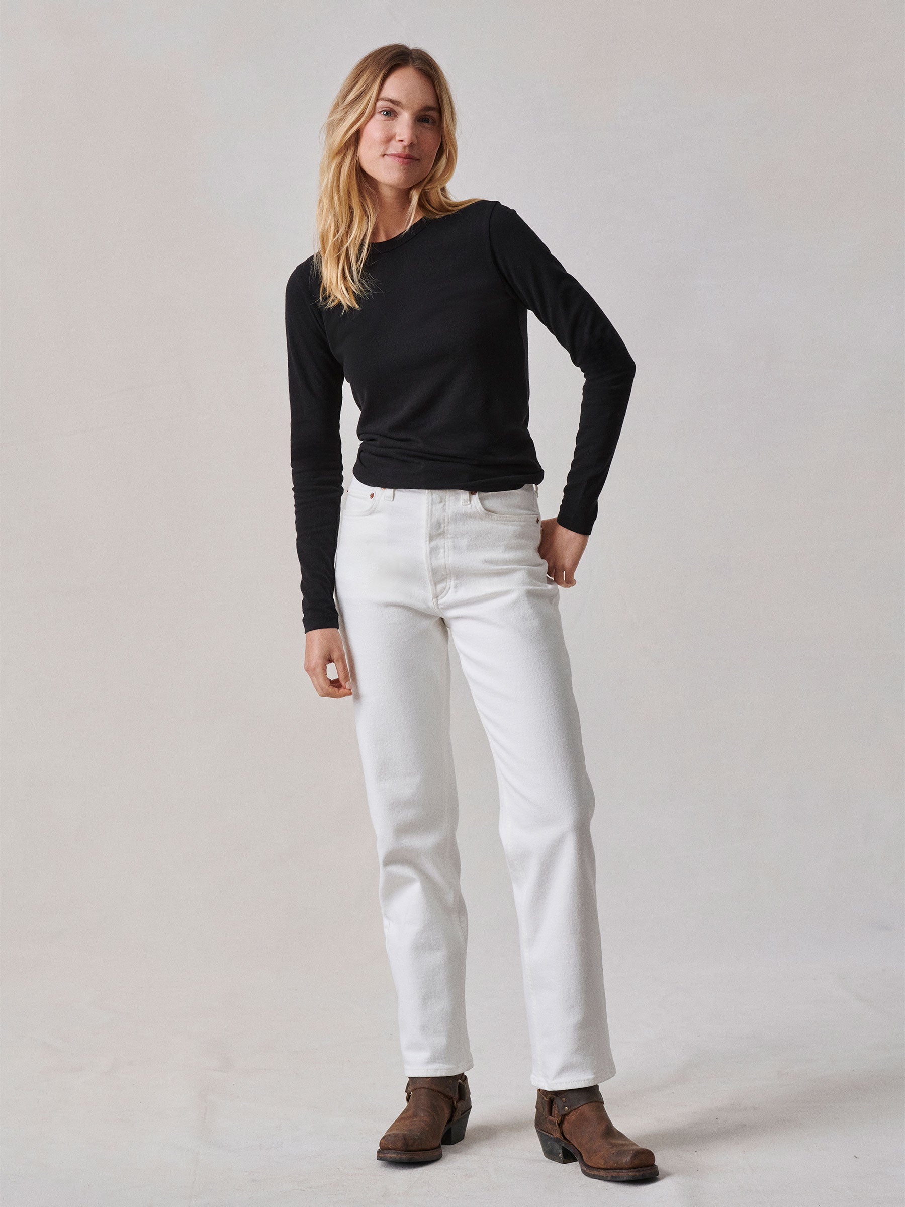 Slim fit long sleeve crewneck tee cut from a supersoft 130 GSM blend of bamboo, cotton, and wool. Features a straight hem, a self bound neck, and raised armholes that hug the contours of the shoulders. Garment washed for a lived-in feel.