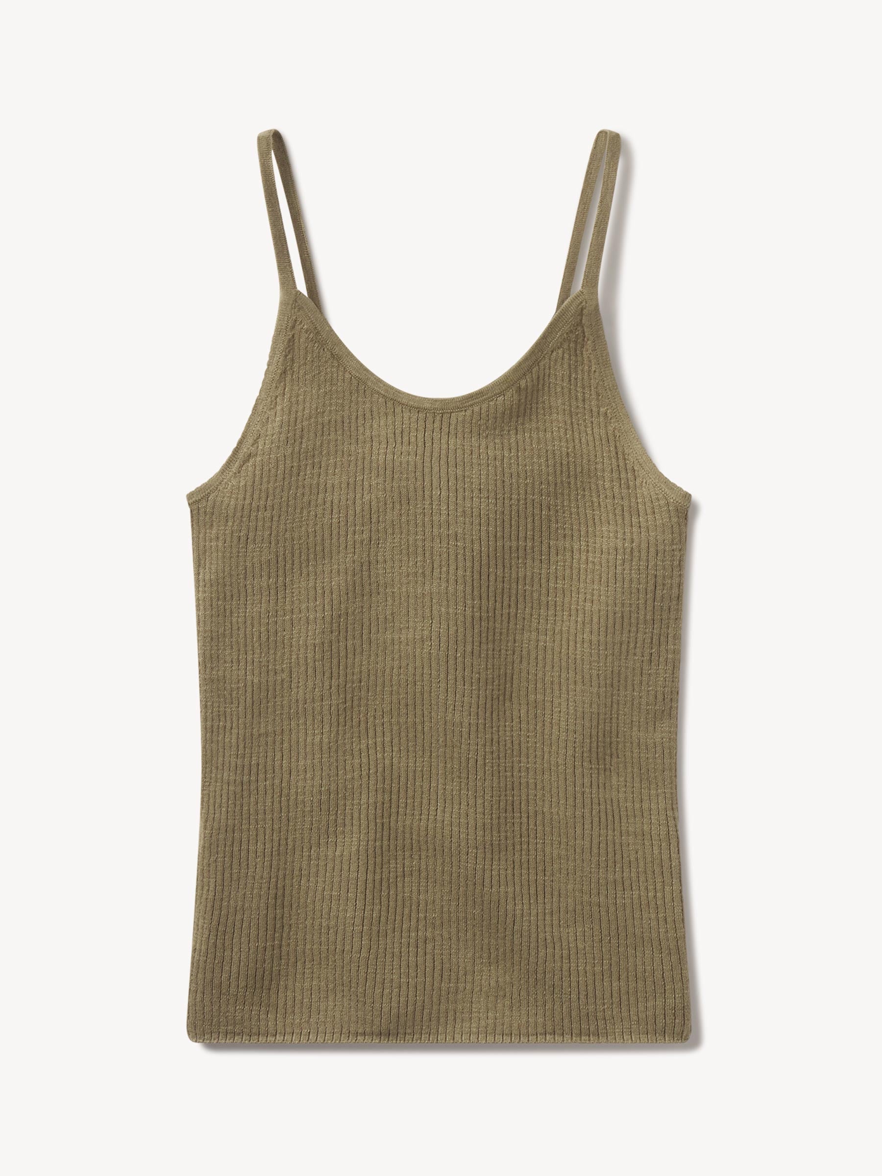 Slim fit, vintage-inspired camisole crafted from a delicate blend of Italian cotton and linen. Constructed from a structured 4×2 rib with a textured hand and a touch of stretch. Garment washed for vintage look and feel.