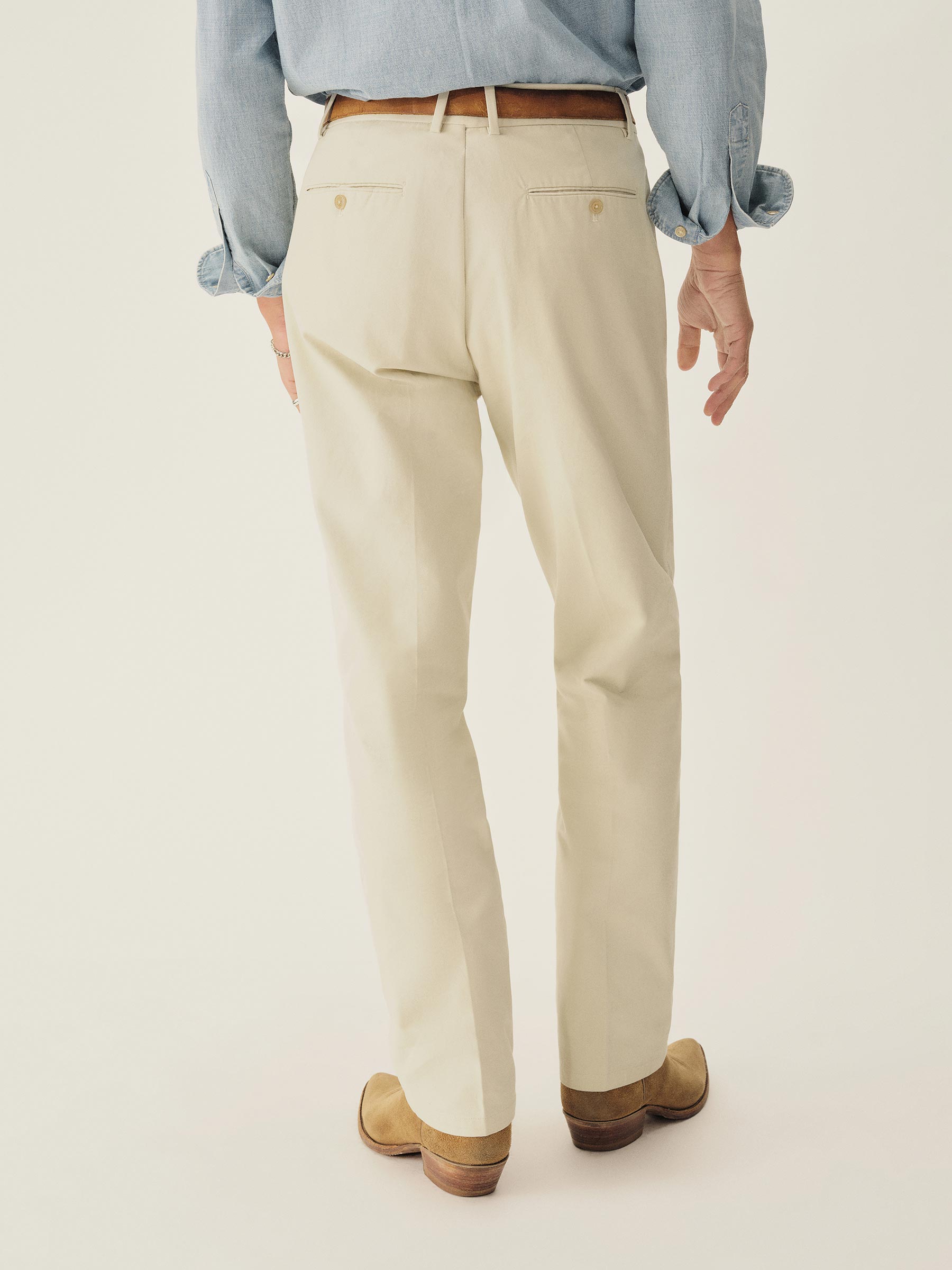 The El Camino Pant is a western-inspired trouser crafted from brushed Japanese cotton twill, built with 1960s-era frogmouth front pockets, waist tab closures, and a split waistband. Modeled after polished rodeo styles, the leg runs slim and straight from a mid-high rise down to a boot-ready opening.