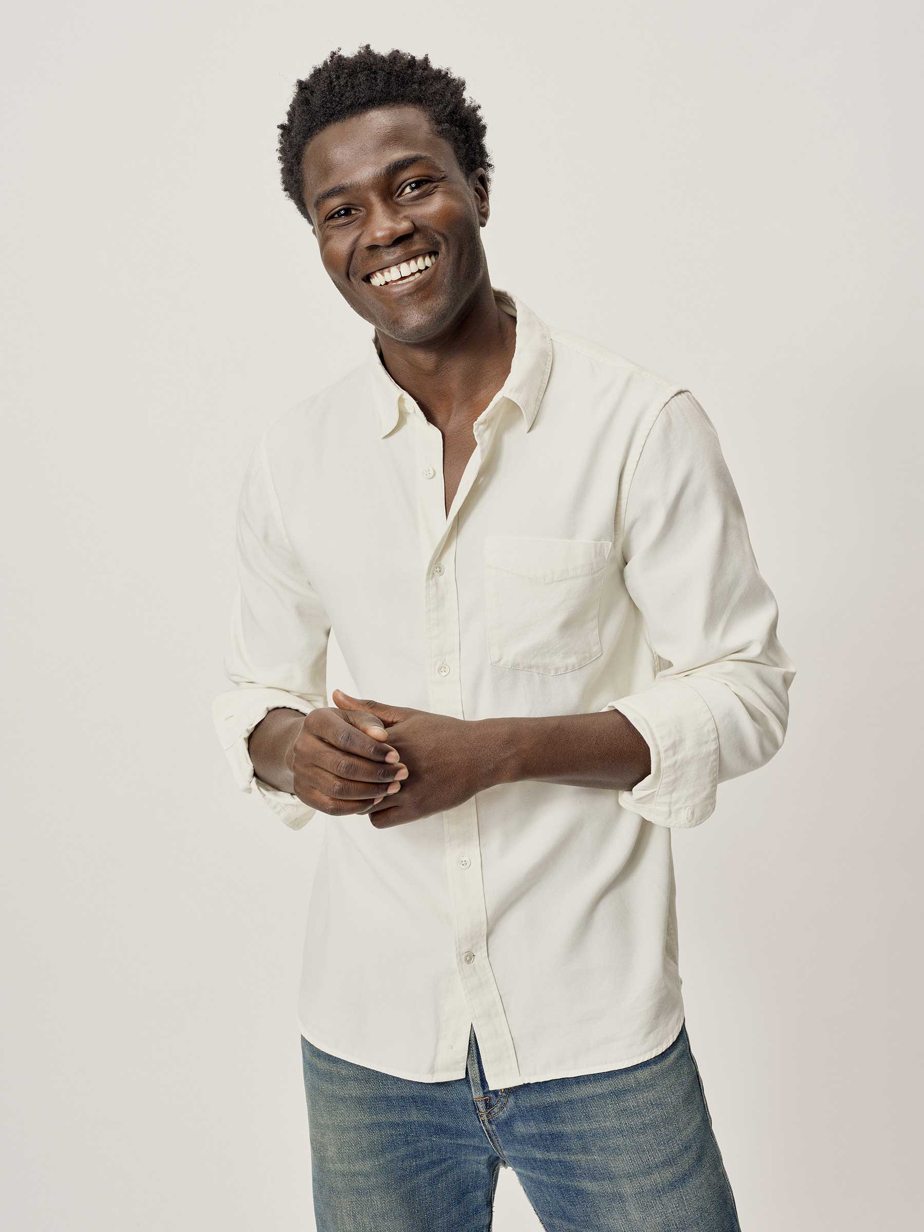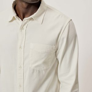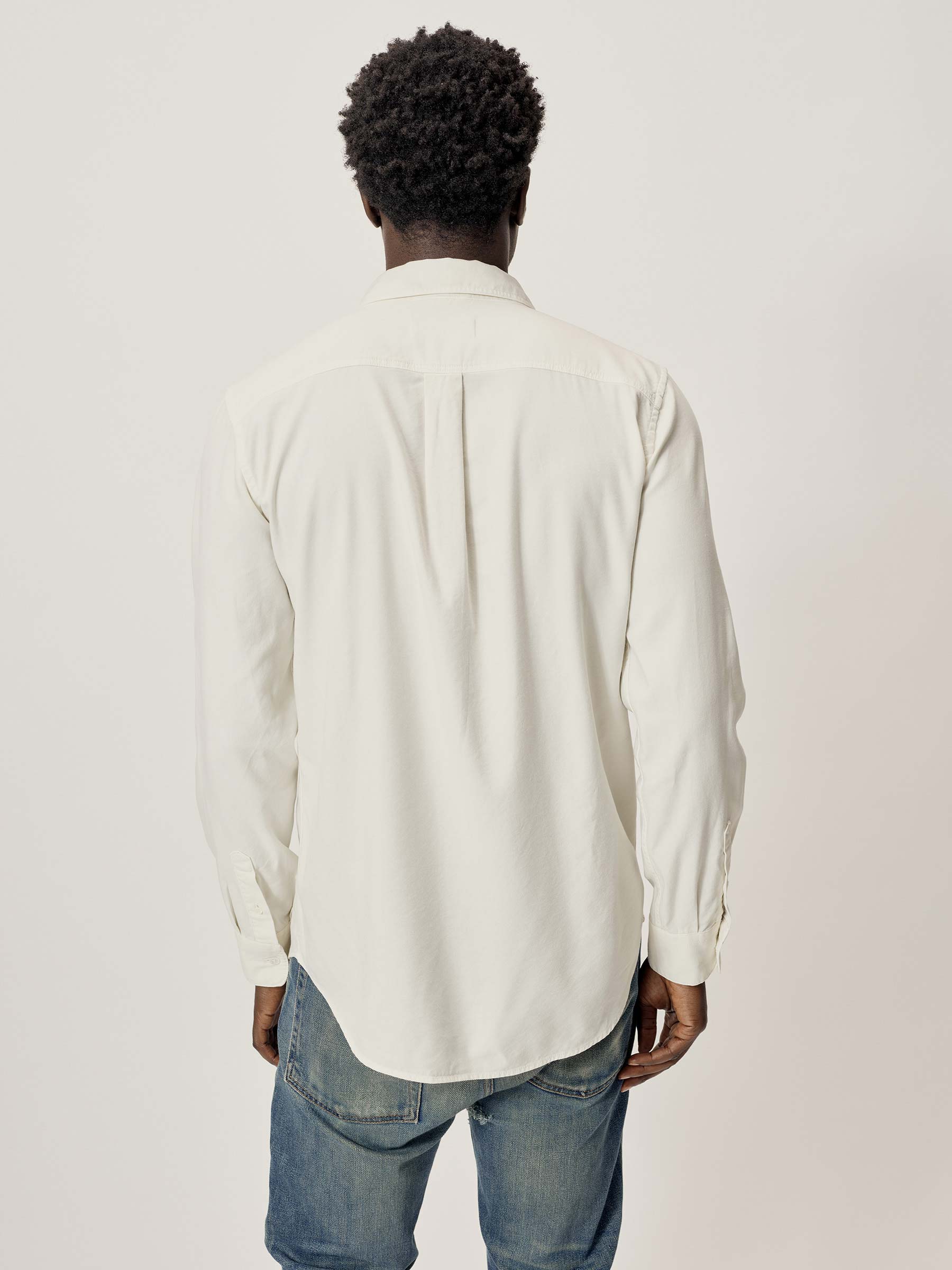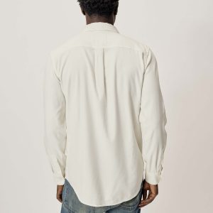 Slim fit long sleeve button up shirt in 5.25 oz. cotton/rayon twill with a subtle luster and an easy drape. Details include mother of pearl buttons, a single spade pocket at the chest, and a box pleat at the back yoke. Constructed with single needle topstitch detailing with double needle stitching at the collar and cuffs. Garment washed with softener for a lived-in feel.