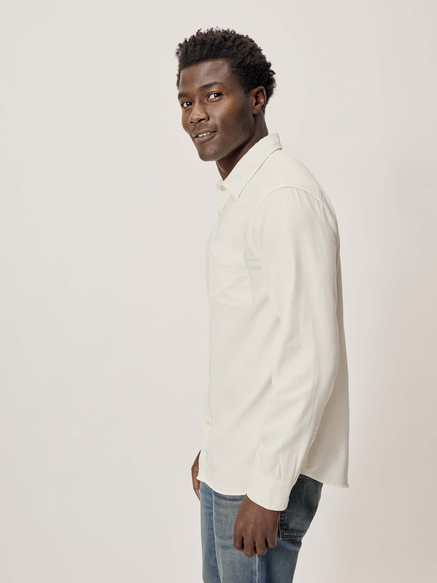 Slim fit long sleeve button up shirt in 5.25 oz. cotton/rayon twill with a subtle luster and an easy drape. Details include mother of pearl buttons, a single spade pocket at the chest, and a box pleat at the back yoke. Constructed with single needle topstitch detailing with double needle stitching at the collar and cuffs. Garment washed with softener for a lived-in feel.