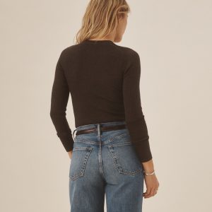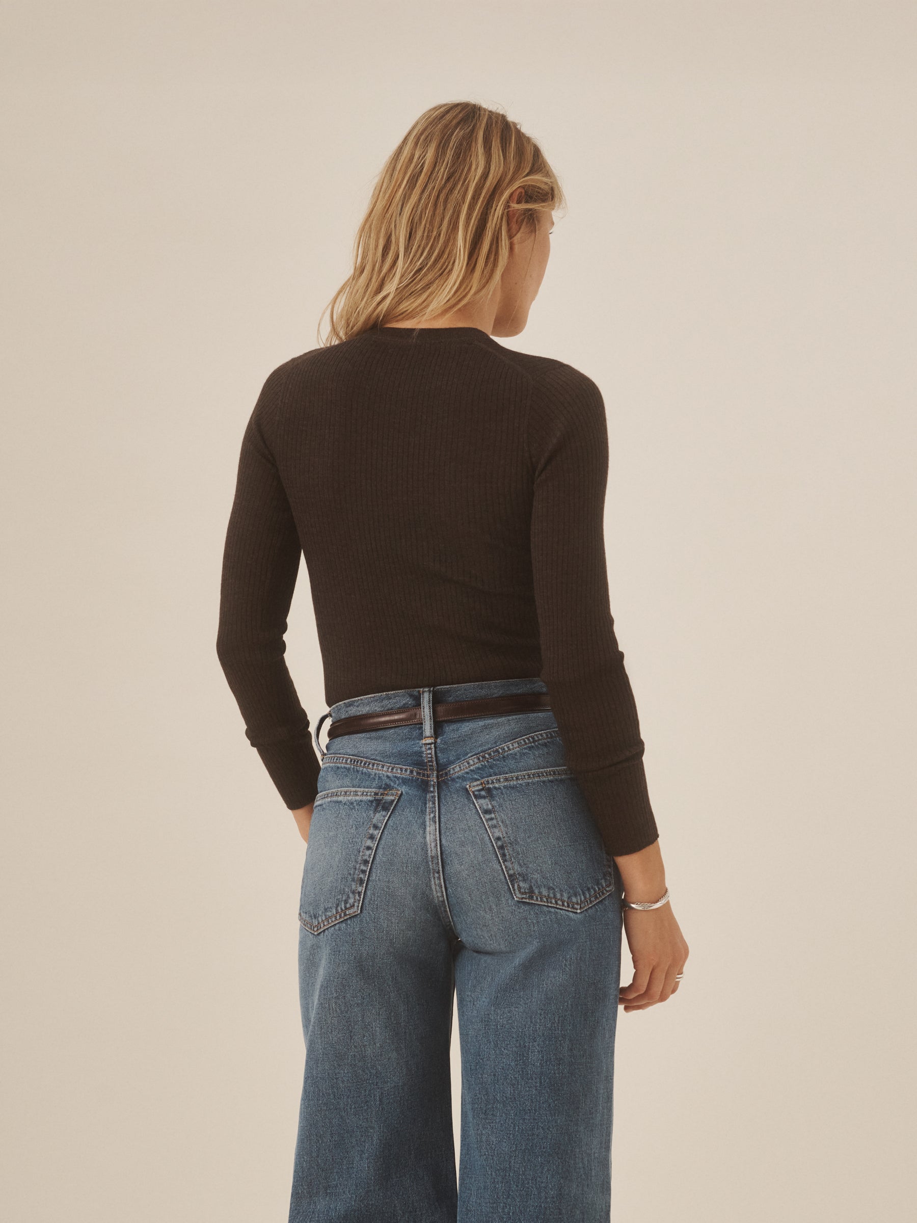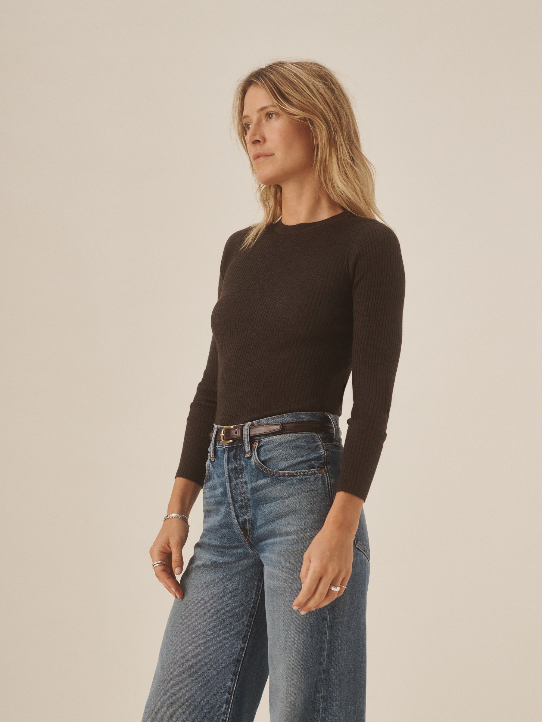 Slim fit crewneck sweater in a 24″” length, elevated in a 14 gauge variegated rib knit from a blend of merino wool, silk, and cashmere. Luxe, easy, and ideal for layering. Constructed with self-starting hem and sleeve trim and fashioning at the neckline and back shoulder for durability.