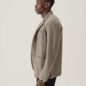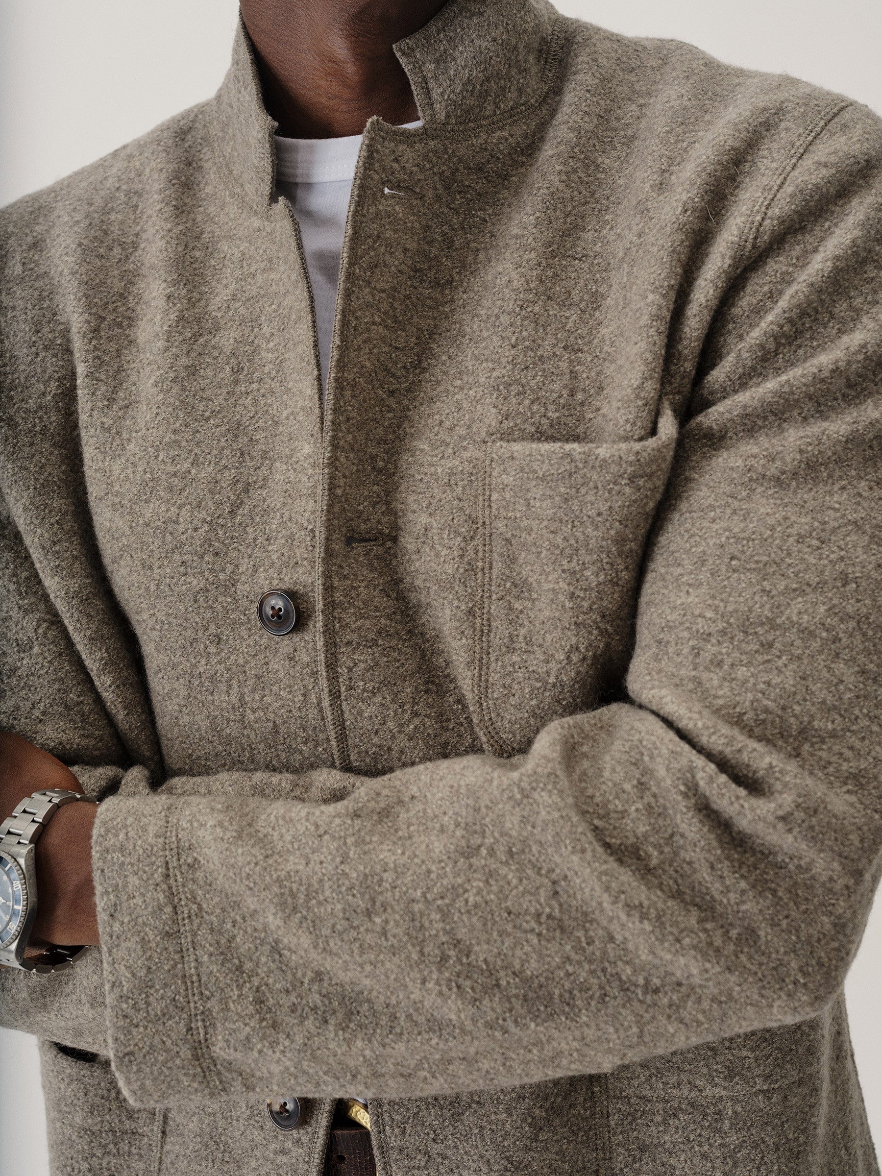 Classic fit chore coat with a slimmer cut through the arms and room in the torso for layering. This 340 GSM felted merino wool has been twice boiled for improved insulation and durability. Details include three patch pockets, real horn buttons, and a notch collar. Constructed with hand-sewn facings and cover-stitching throughout.