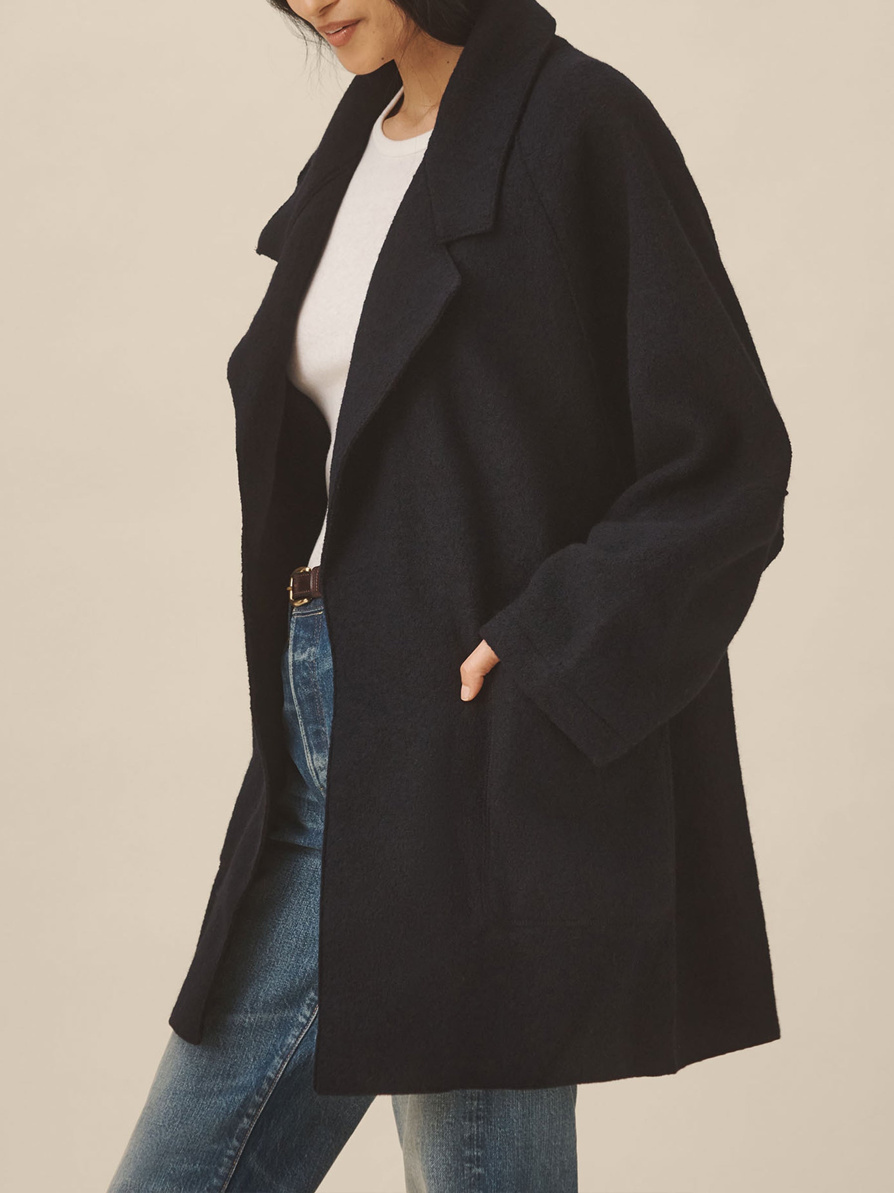 Relaxed fit blanket coat with room through the arms and torso for layering. This 340 GSM felted merino wool has been twice boiled for improved insulation and durability. Details include two front patch pockets and a notch lapel collar. Fully unlined construction with lapped seams throughout for a beautiful, natural drape.