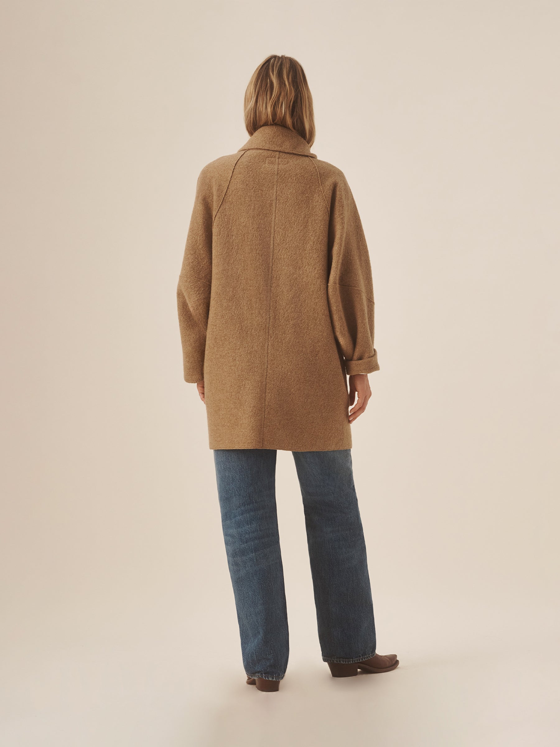 Relaxed fit blanket coat with room through the arms and torso for layering. This 340 GSM felted merino wool has been twice boiled for improved insulation and durability. Details include two front patch pockets and a notch lapel collar. Fully unlined construction with lapped seams throughout for a beautiful, natural drape.