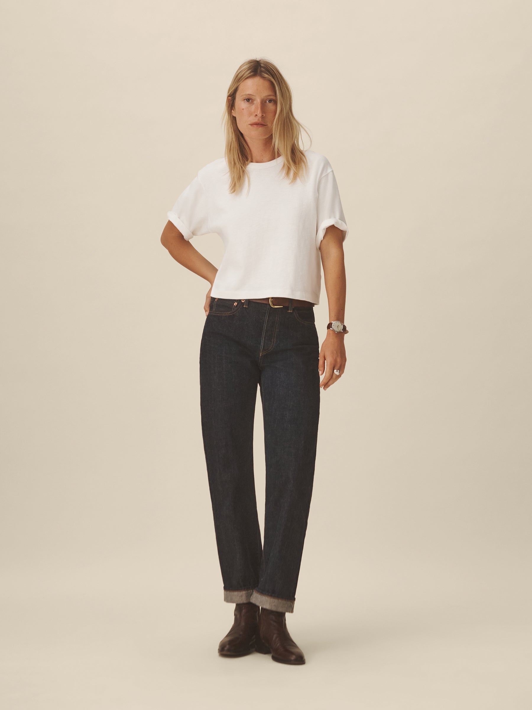 Cut from a heavyweight 310 GSM cotton, this slightly oversized, boxy crewneck tee has a straight hemline that hits right at your natural waist. Double-washed for a soft, smooth texture and consistent fit.