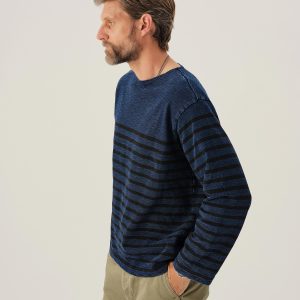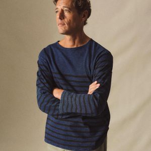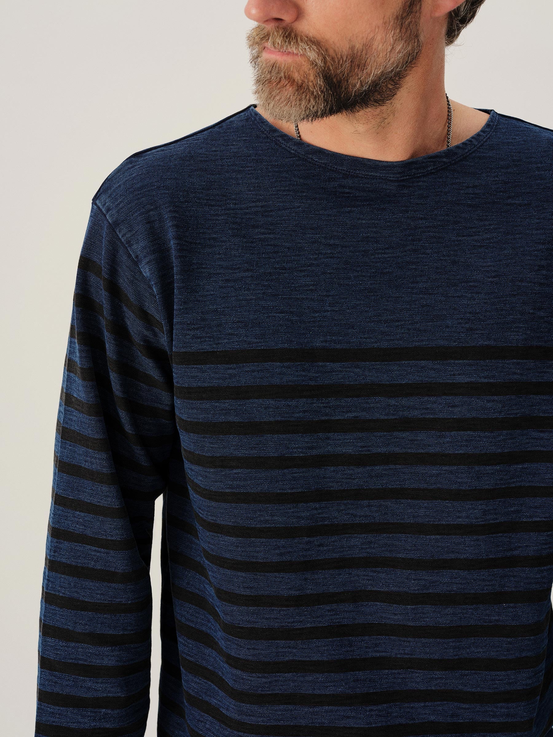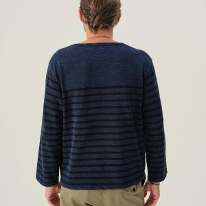 Nautical-inspired boxy fit short sleeve wide neck tee with a straight hem, longer sleeve length, drop shoulder, high neck, and wide ribbed collar. The soft cotton jersey, yarn-dyed in indigo and black sulfur stripe pattern, is about twice as heavy as our Pima tees, with tiny vertical ribs that gently glide across the skin. This is a solid, substantial stand-alone tee for cold weather that will pick up a ton of character over time.