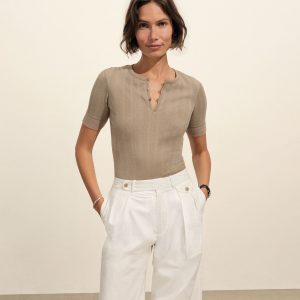 Military-inspired short sleeve henley, crafted from a superfine blend of new and recycled cotton with a subtle, textured rib. Featuring a three-button loop placket and sleeve cuffs. Finished with mother of pearl buttons and garment washed for a lived-in feel.