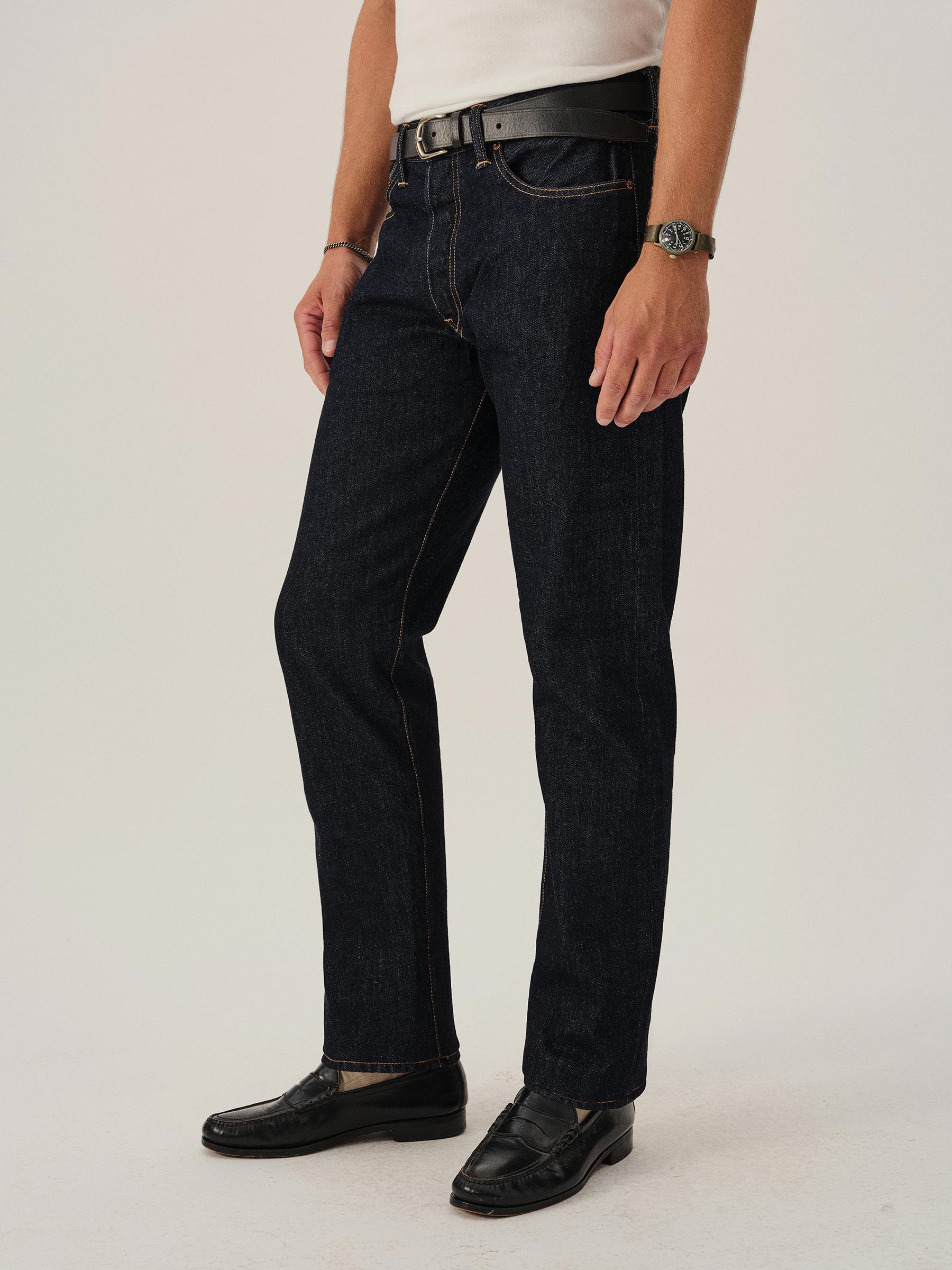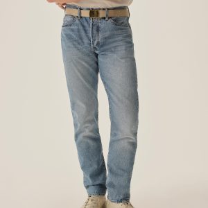A classic 5-pocket jean in our Ford Standard fit: mid-rise, straight through the thighs with a taper below the knee. Inspired by our favorite vintage jeans, this 14 oz denim from Japan-based Kaihara mills has a hint of stretch and an organic texture that develops more character with every wear. Garment rinsed for a lived-in feel. Details include copper rivets and a metal tack button fly.