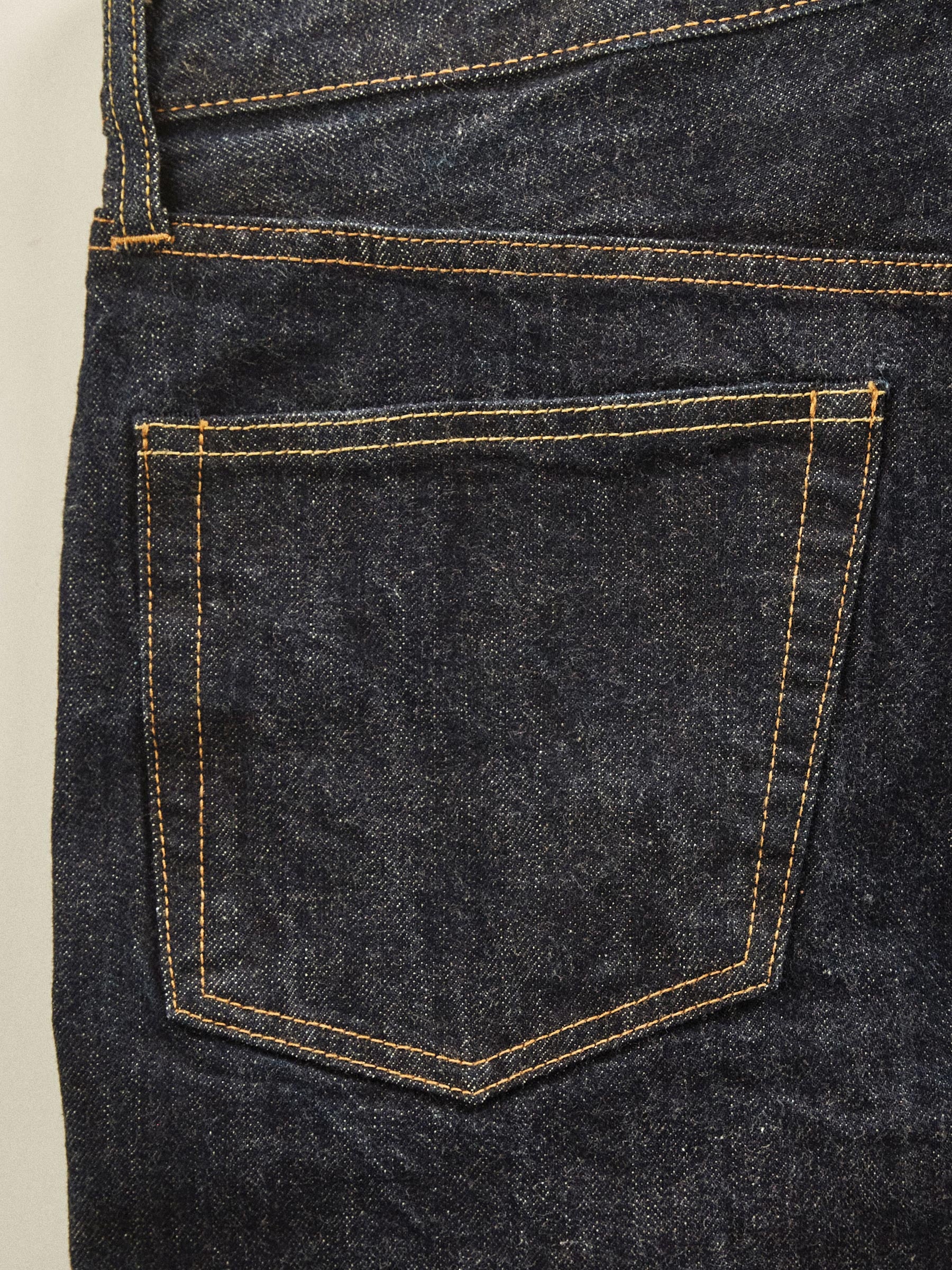A classic 5-pocket jean in our Cowboy fit: Slightly higher rise with a tailored fit through the thigh and leg. Inspired by blue jeans from the 1940s through the 1960s, this shuttle loomed 14 oz. selvedge denim is unsanforized, and has an organic texture that develops more character with every wear. Garment rinsed for a lived-in feel. Details include copper rivets and a metal tack button fly.