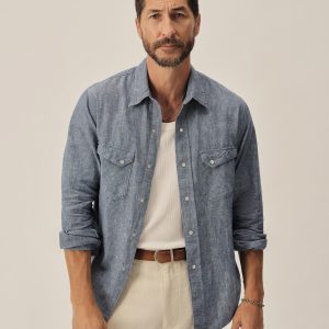 In the style of the 1940s, a classic fit western with no front yokes that lends itself to a more tailored style of dress, cut from a yarn-dyed blend of breezy linen and cotton. Featuring slanted pocket flaps, a pointed back yoke, and snap button fasteners.