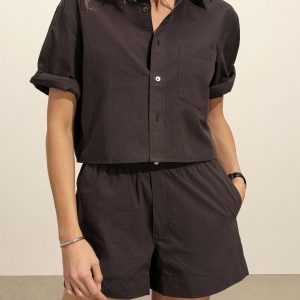 Pull-on shorts inspired by men’s military boxers, made from 2.8 oz. cotton plainweave. Relaxed, high rise fit with a 4” inseam. Featuring faux button and zip fly, an elastic waistband, on-seam side pockets, and back patch pockets. Finished with a mother of pearl buttons and garment washed for a broken-in feel.