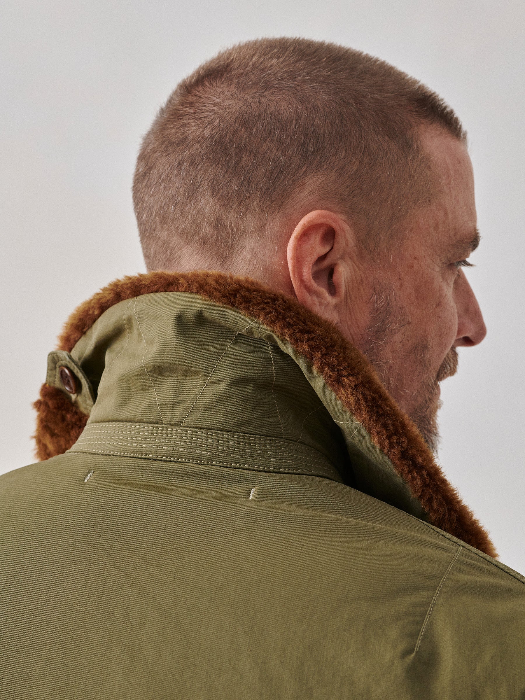 In 1944, the B-15 jacket became standard issue for the USAAF. We’ve brought it into the 21st century with a premium weather cloth we developed with Olmetex in Italy, blending a premium finish with all-weather performance. Filled with PrimaLoft insulation, it’s finished with a shearling collar, corozo-buttoned throat latch, enamel-coated snap front pockets, interior welt pocket, die-cast zip front closure, and rib cuff and hem.