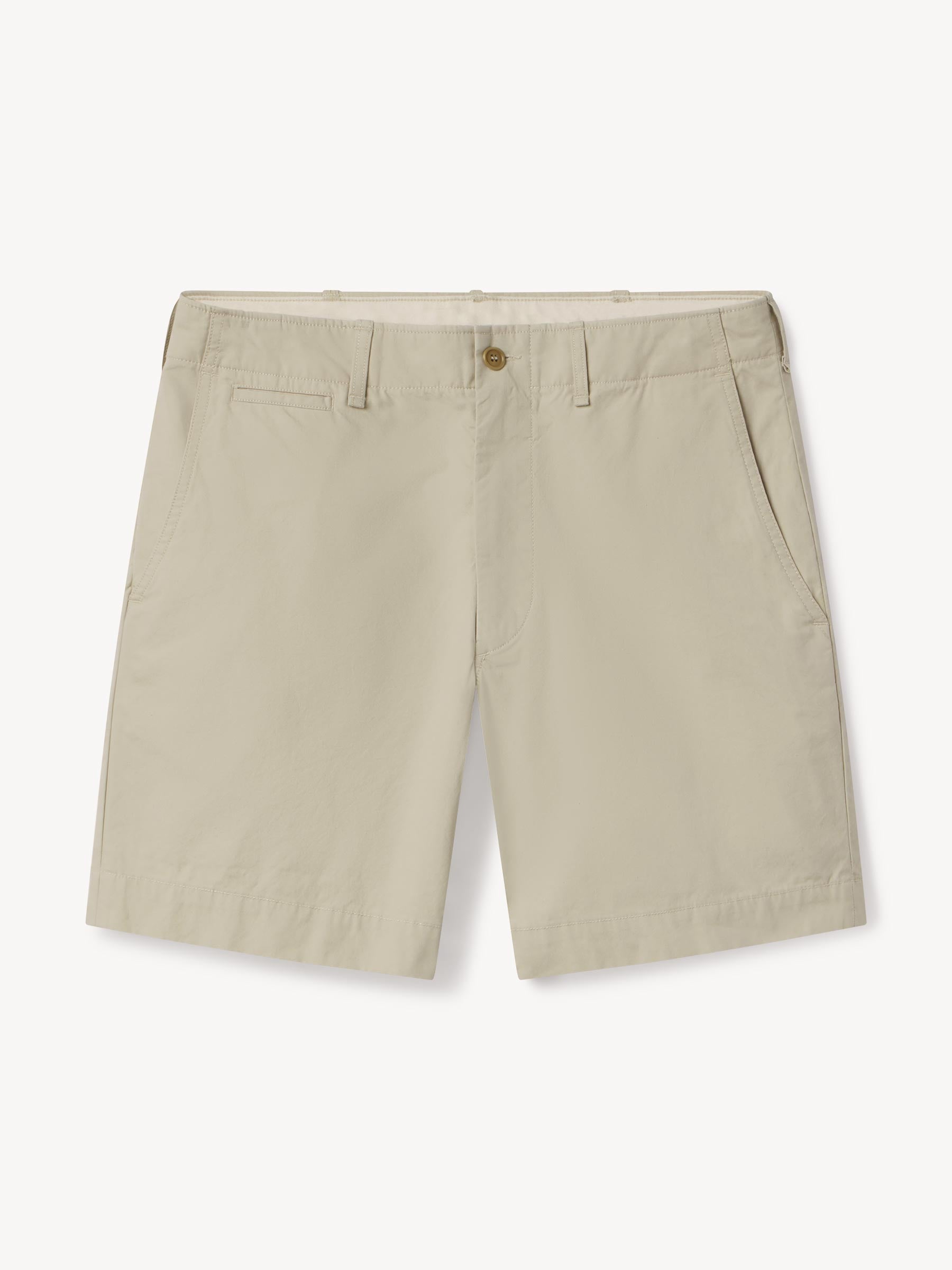 Easy tailored officer short with a tapered leg and 6.5″ inseam. This 5.5 oz. cotton poplin has a crisp hand and light structure suitable for warmer climates. Vintage army chino-inspired details include a Hollywood waistband, slash hip pockets, two single welt back pockets (one of which has a button closure), and a single welt coin pocket. Garment washed with enzymes and softener for a lived in feel. Zip fly with waist button closure.