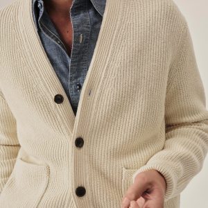 Classic fit fisherman’s cardigan sweater in a homespun textured cotton rib with two patch front pockets and a 5-button front closure. Constructed with hand-linked seams, double layer ribbing at the front placket, and racking stitch detailing at the cuffs.