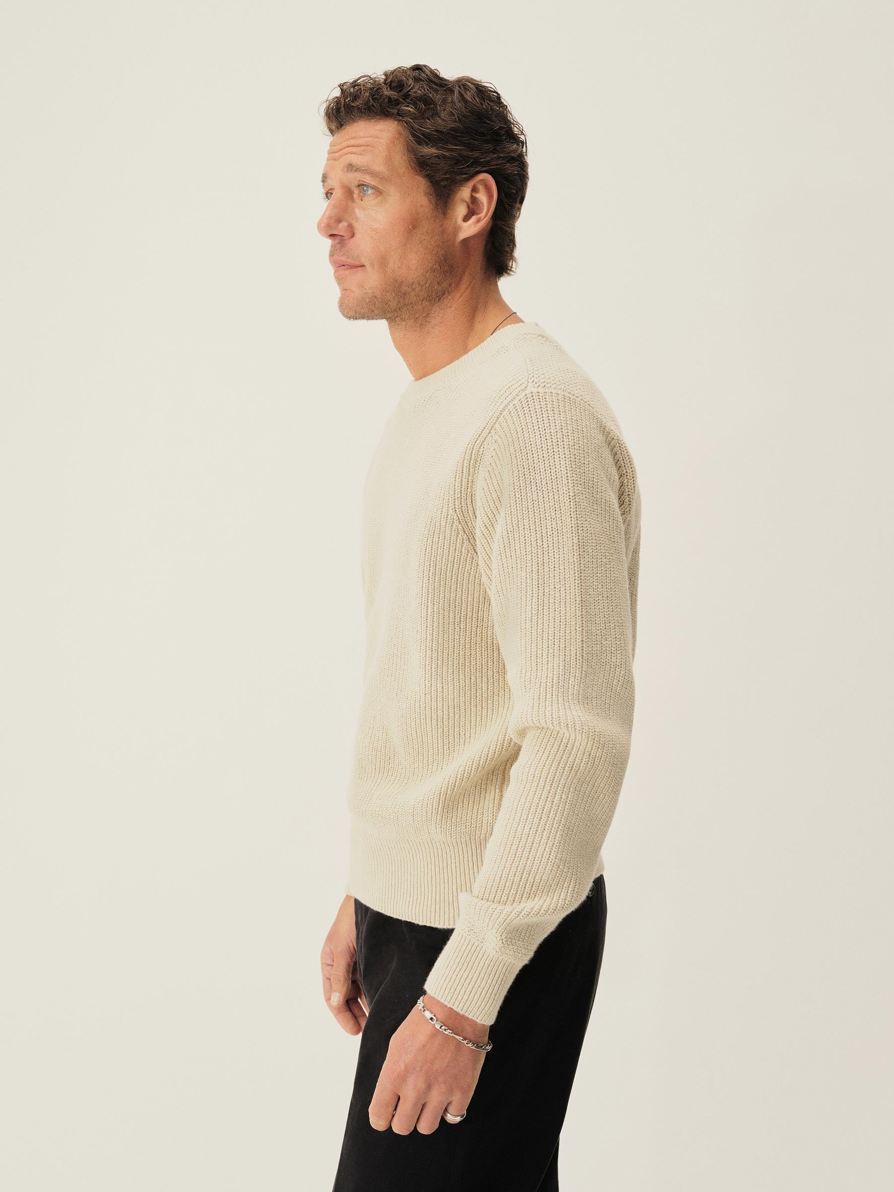 Classic fit crewneck sweater in a homespun textured cotton rib. Constructed with hand-linked seams, double layer ribbing at the collar, and racking stitch detailing at the cuffs.