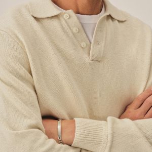 Classic fit polo sweater in a 7 gauge half cardigan rib knit from our homespun yarn-dyed cotton. Features a 3-button rib center front placket with nacre buttons and a rib collar designed to lay flat. Constructed with hand-linked seams and racking stitch detailing at the cuffs.