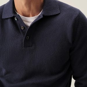 Classic fit polo sweater in a 7 gauge half cardigan rib knit from our homespun yarn-dyed cotton. Features a 3-button rib center front placket with nacre buttons and a rib collar designed to lay flat. Constructed with hand-linked seams and racking stitch detailing at the cuffs.