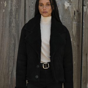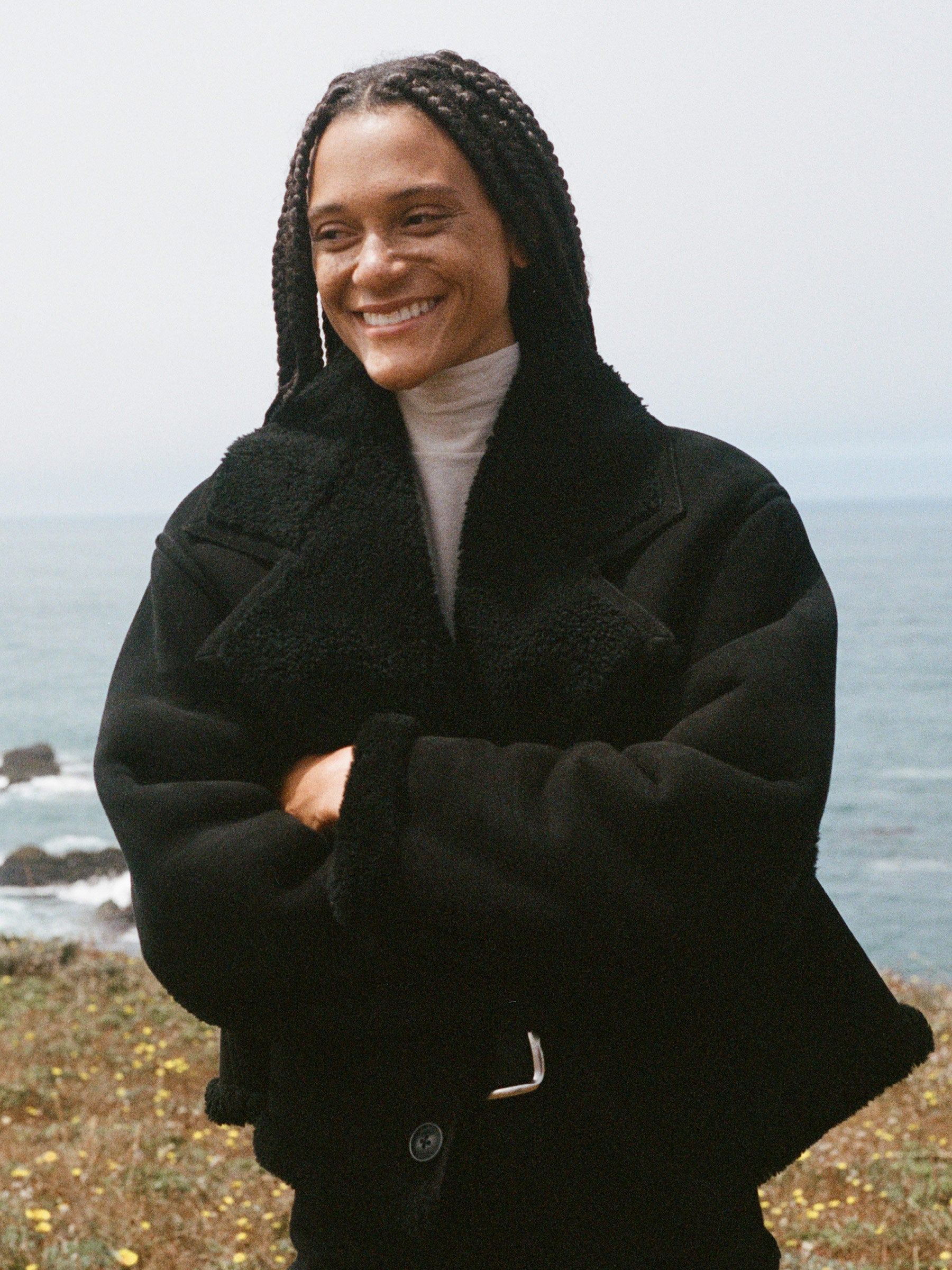 Relaxed shearling jacket in a 25” length. Hand-cut from vegetable tanned lambskin with a suede face and a semi-curl back. Authentic vintage details include easy armholes and sleeves for comfortable layering, horn buttons, and shearling-lined welt pockets. This hide has been vegetable tanned, top dyed, and tumbled for a lived-in look and feel.