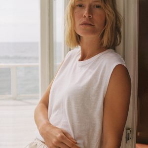 Relaxed muscle tank with a straight hem, cut from 125 GSM cotton with light slub texture. Modeled on a vintage men’s tee with the sleeves cut off. Knit in Los Angeles and washed for a lived-in feel.