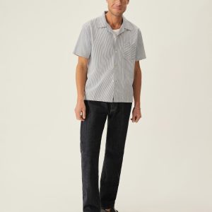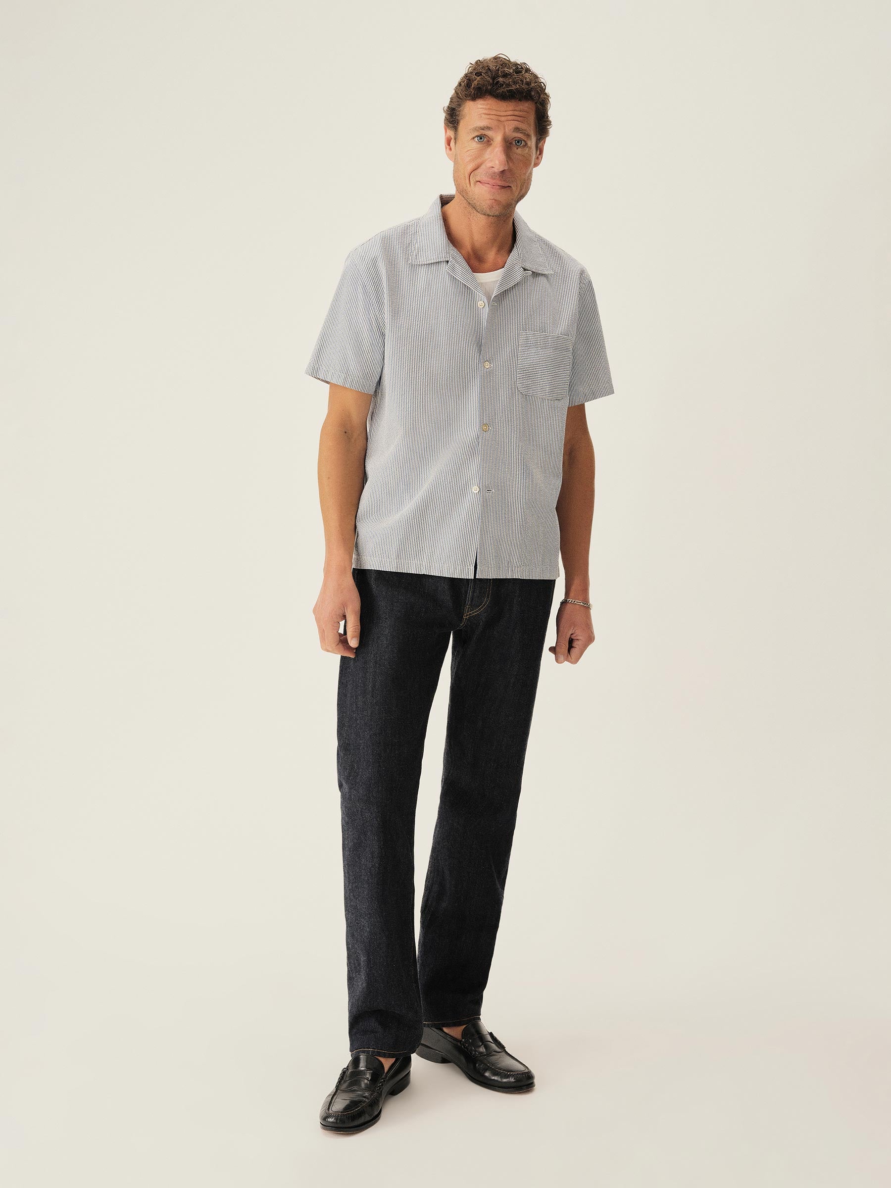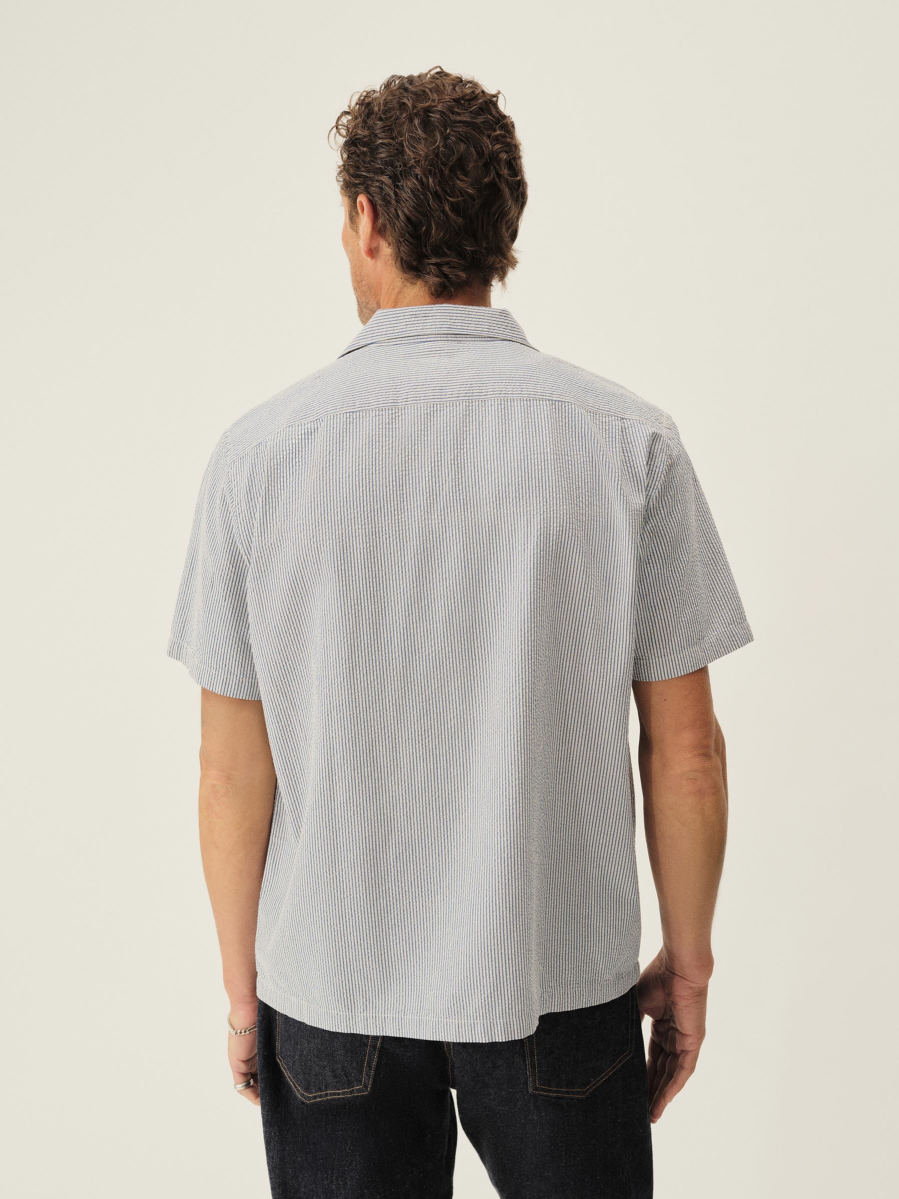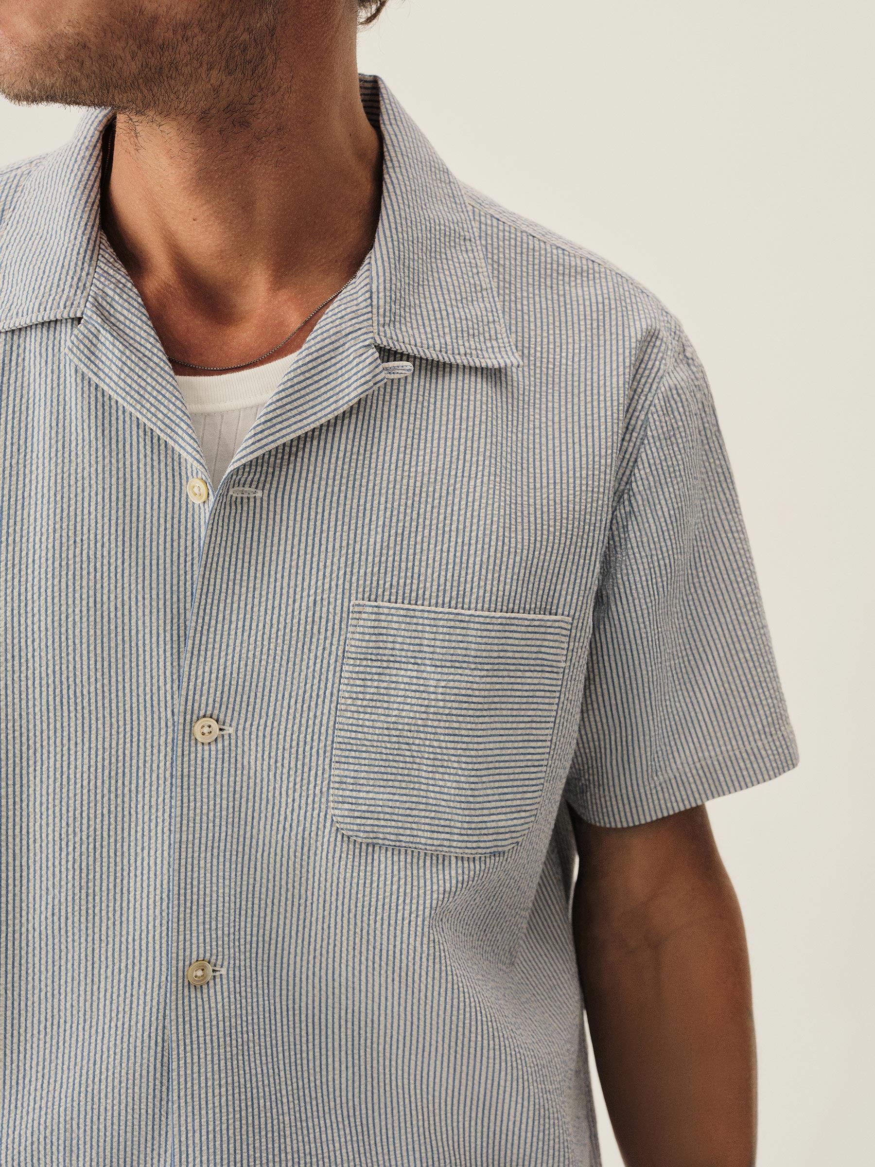 A light, airy seersucker camp shirt cut in a boxy fit with a straight hem. Features a one pocket construction and Mother of Pearl buttons.