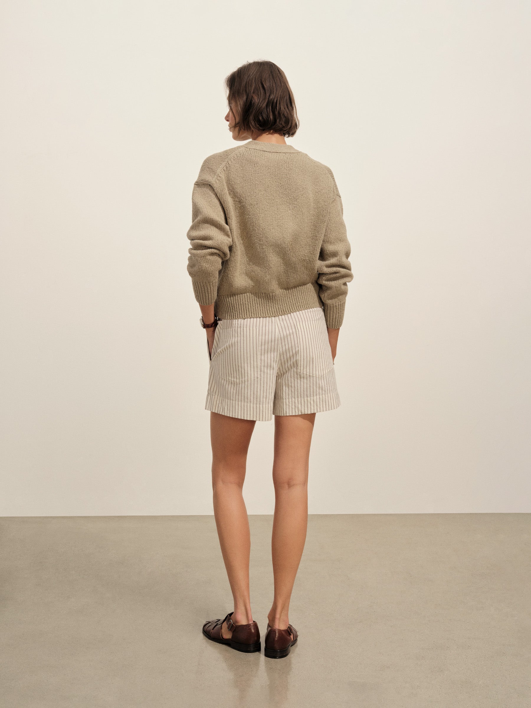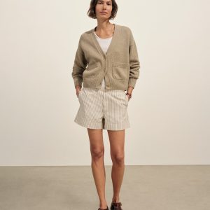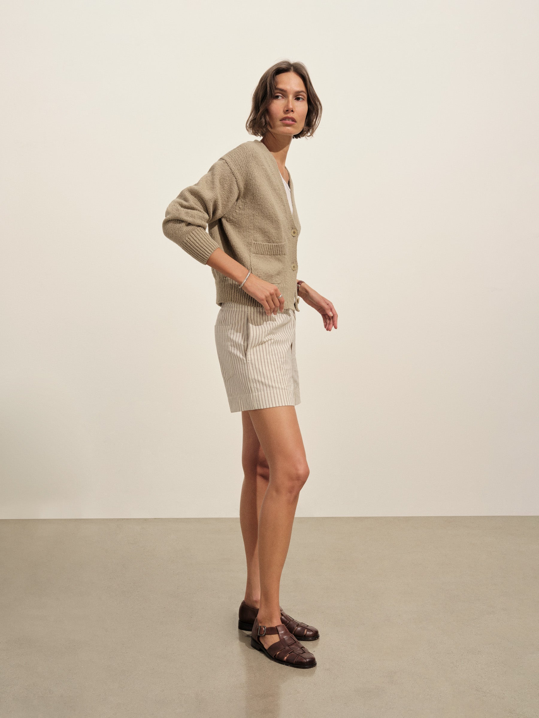 Relaxed cardigan sweater in 5 gauge lofty homespun cotton with a buttery soft finish you’ll love wrapping up in. Features two patch pockets, corozo buttons, drop shoulder, and ribbed cuffs and hem.