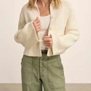Relaxed, rib-stitched collared cardigan made from a lofty 5 guage cotton. Garment washed for a lived in, vintage feel and completed with corozo buttons and an easy, slightly laid back silhouette.