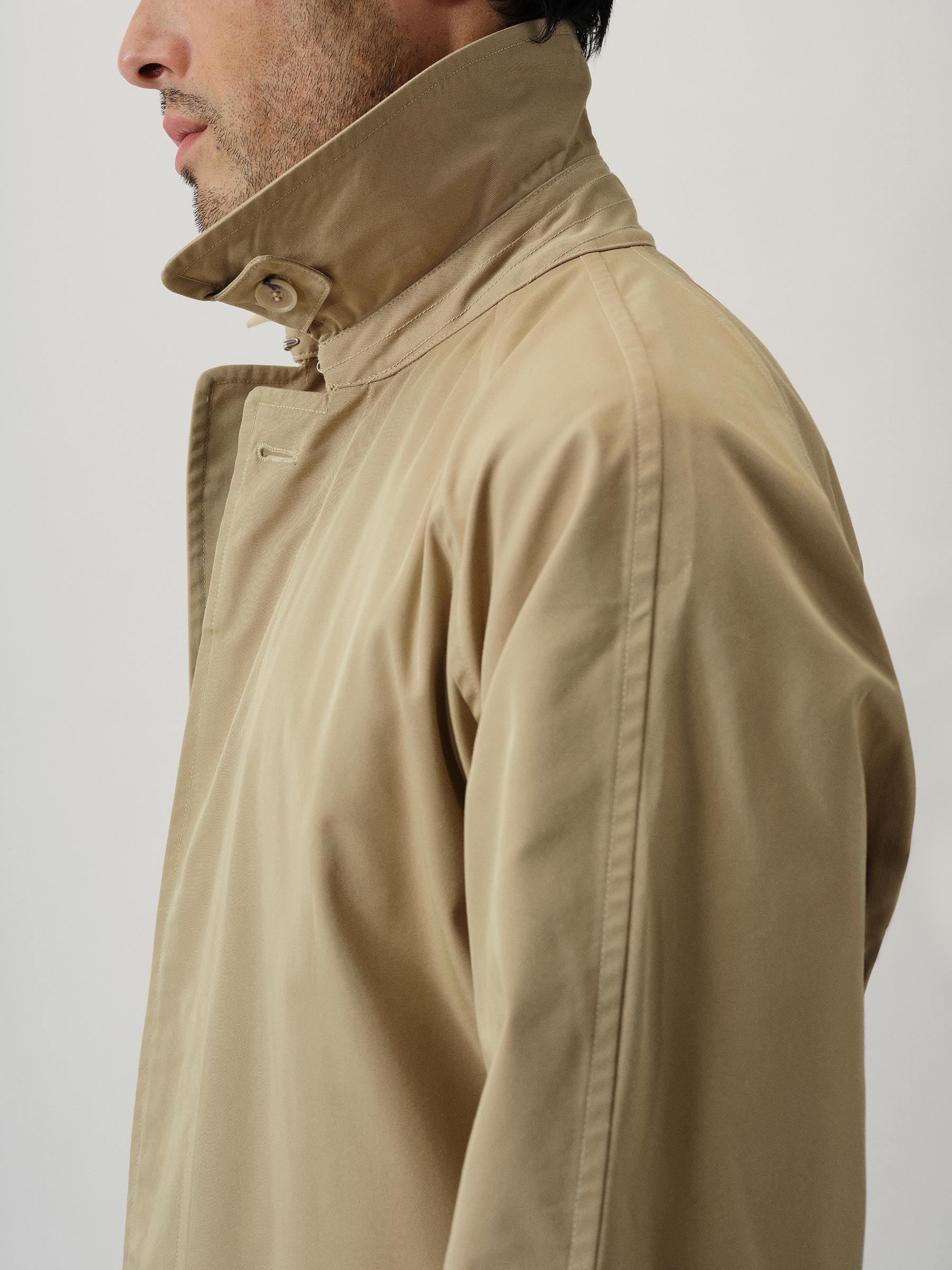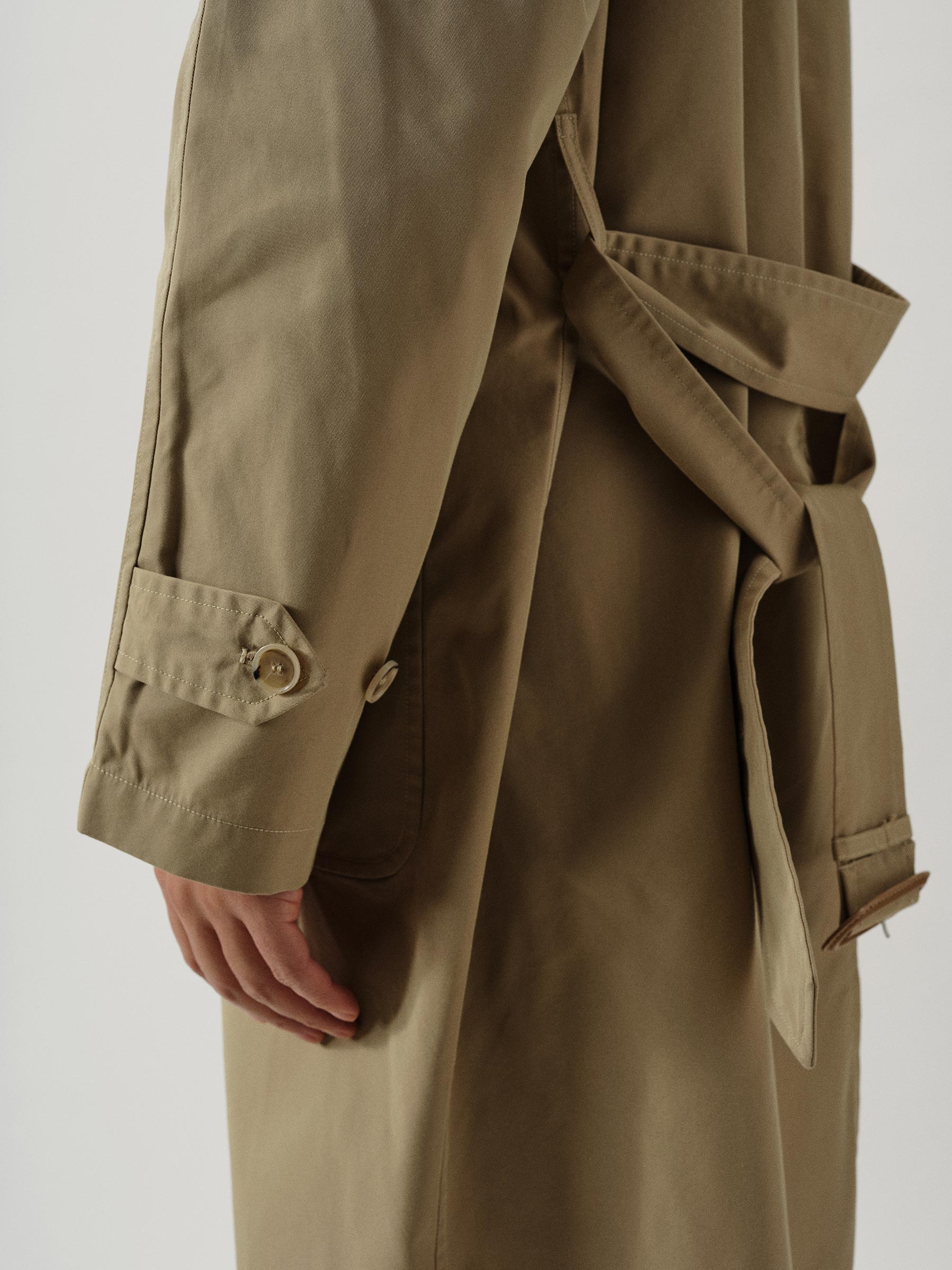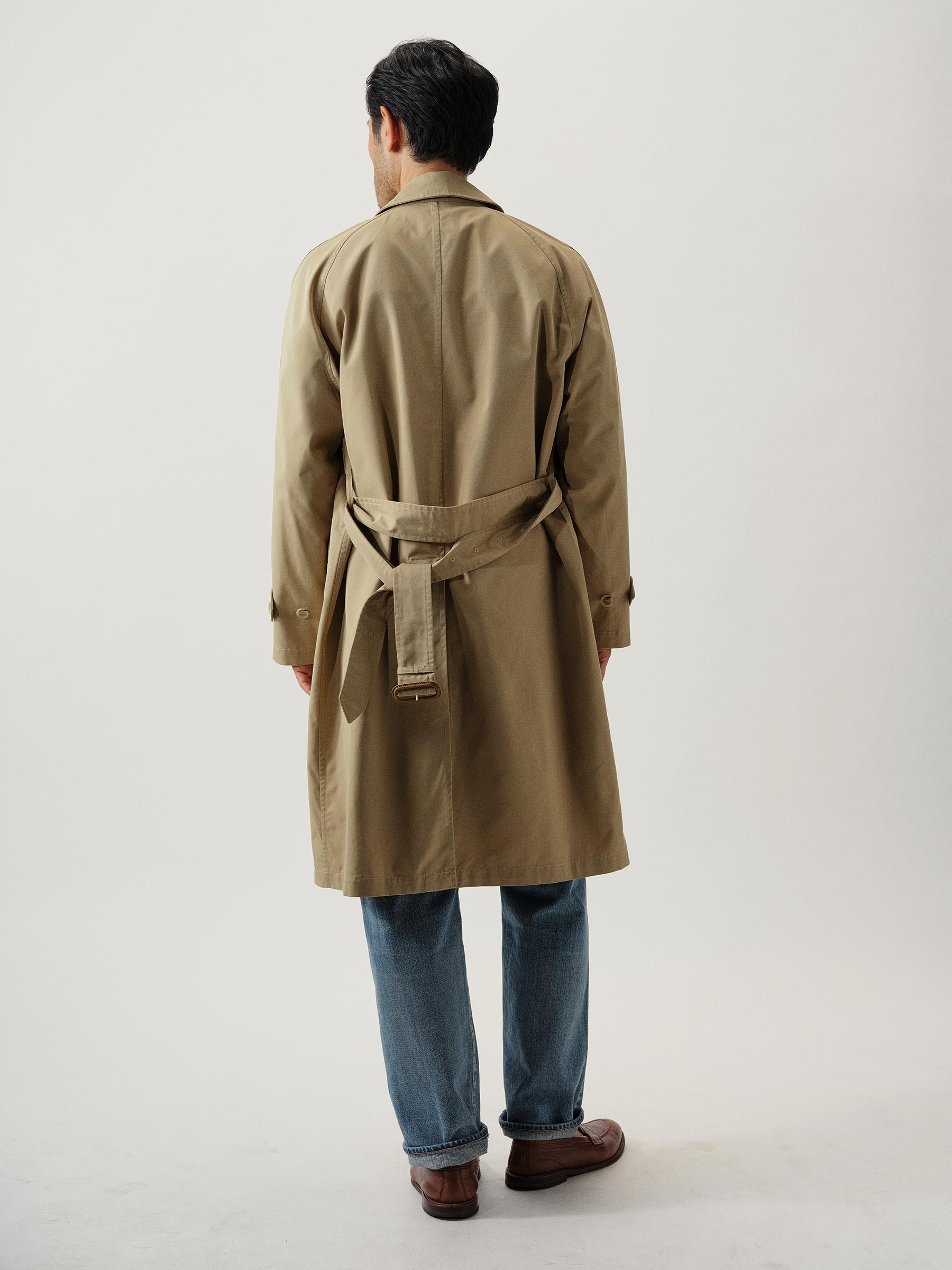 Relaxed, vintage-inspired trench coat cut from 5.7 oz yarn-dyed cotton/poly twill weather cloth with a DWR finish. Features patch and flap pockets, raglan sleeves, buttoned tab cuffs and throat, and a deep back vent. Includes a removable belt with leather buckle for cinching the waist.