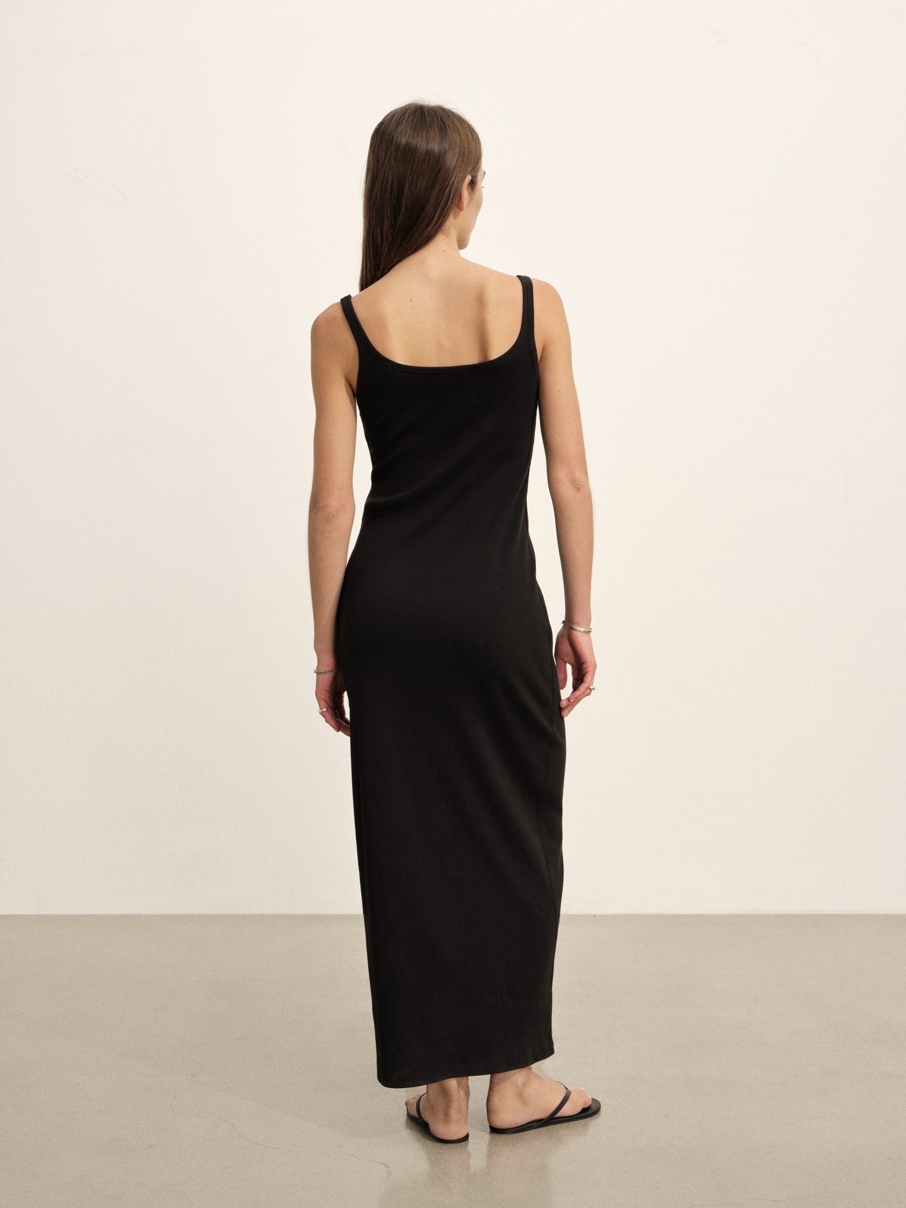 Slim fit ribbed scoop neck tank dress that’s fitted to the waist, then relaxes to hit below the calf in a 54” length. An easy, flattering silhouette in 295 GSM stretch cotton that holds its shape. 2×2 rib structure—two rows of rib stitch, two rows of jersey stitch—is offset by contrast 1×1 rib at the neck. Constructed with coverstitching throughout and flatlock stitching and godets at the side seams for extra volume. Garment washed for a lived-in feel.