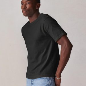 Cut from a midweight 200 GSM USA-grown cotton, developed, milled, and sewn at BM Knitting Mills in Mohnton, PA. This 90s-inspired boxy crewneck tee has a straight hemline, longer sleeves that hit lower on the bicep, and a wide ribbed collar. Bound neck and screen-printed label for comfort, constructed with a split-needle cover stitch at shoulders and armholes. Double-washed for a soft, smooth texture and consistent fit.