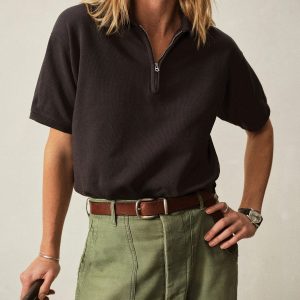Oversized, quarter-zip sweatshirt that sits below the waist. Features an off-shoulder fit with rib-banded cuffs and hem.