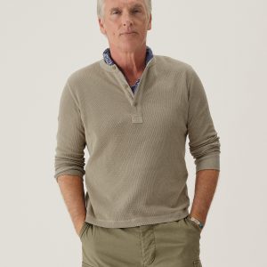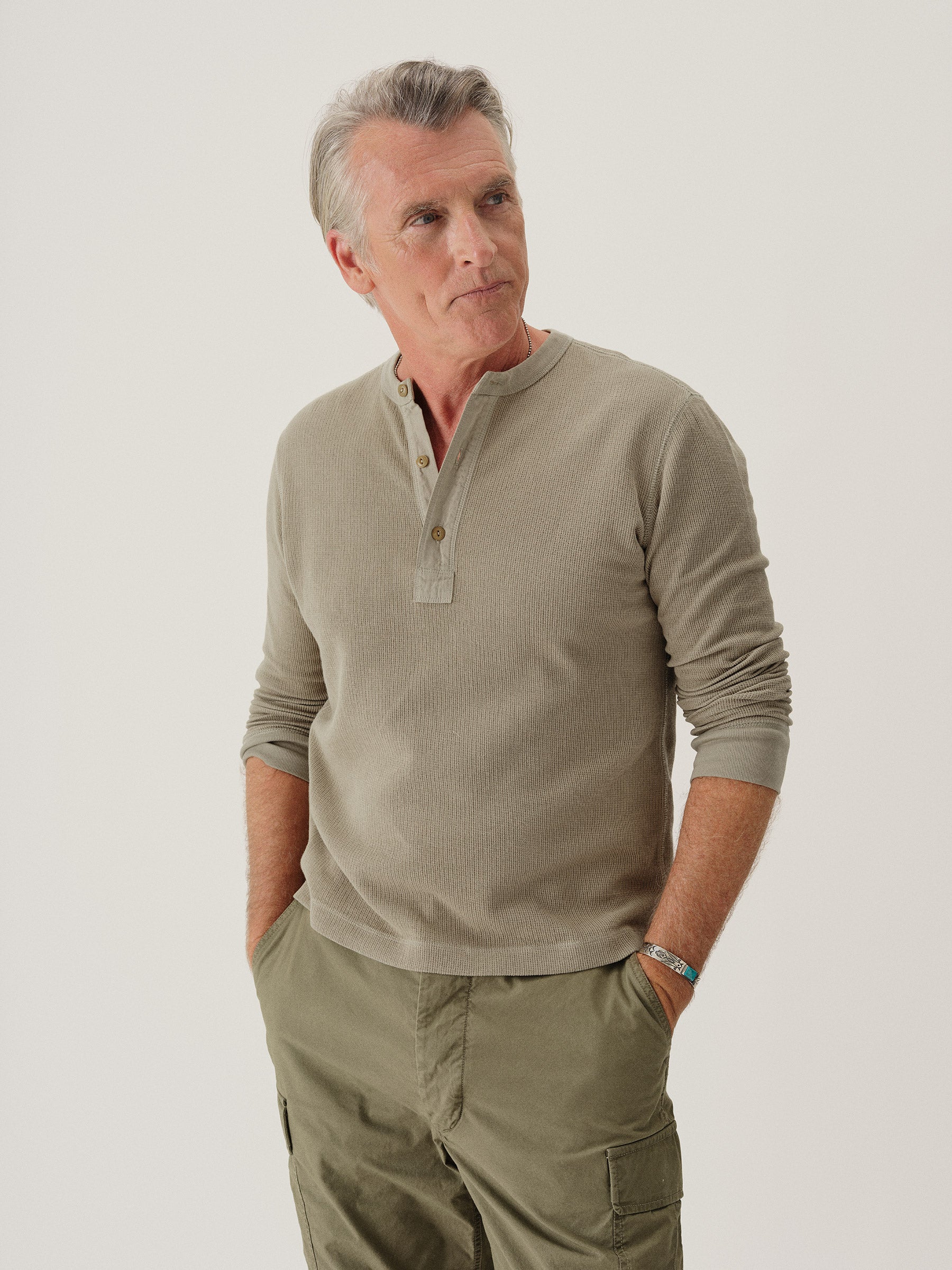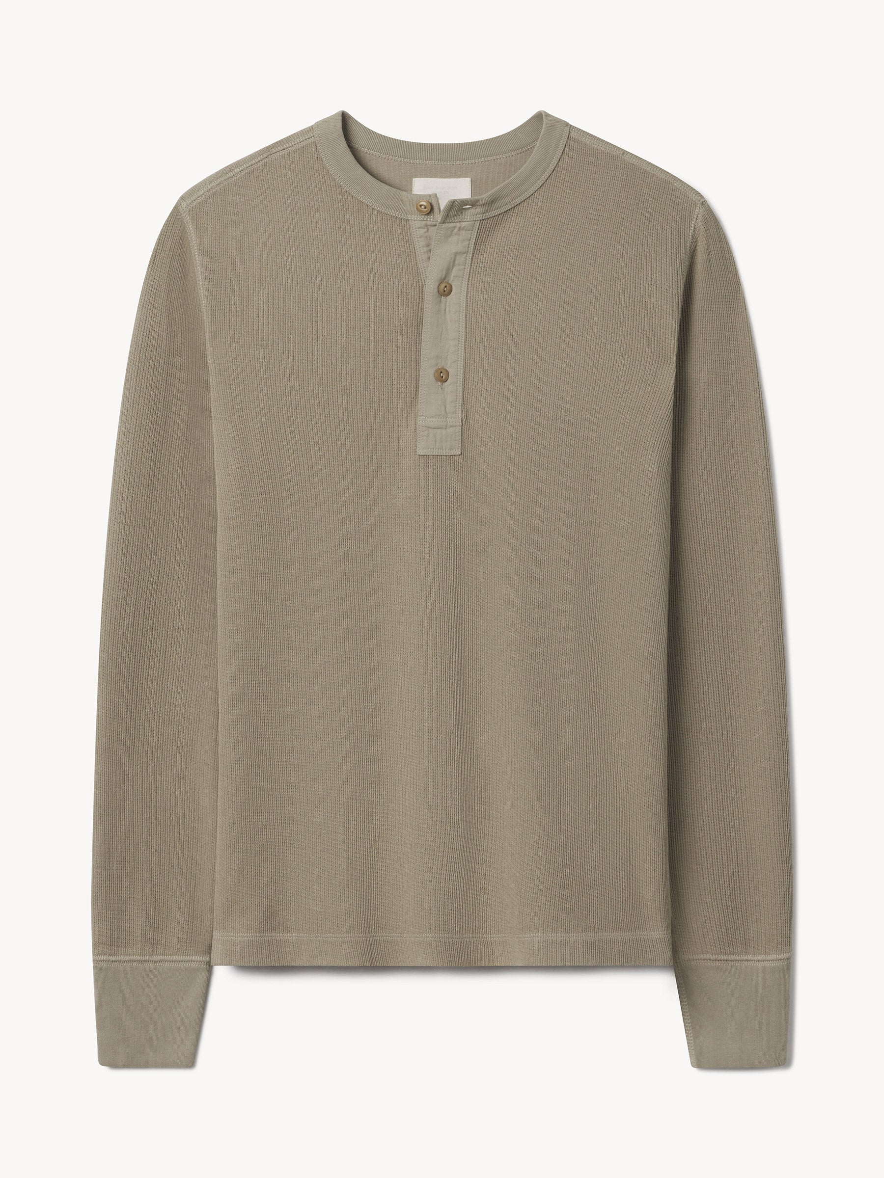 Classic fit thermal long sleeve henley with a straight hem. This 250 GSM French rib cotton double knit features a waffle-knit face and a smooth jersey back. Details include a woven three-button placket and corozo buttons. Constructed with ribbed cuffs and flat-lock stitching throughout for improved comfort and durability. Garment washed with enzymes and softener for a lived-in feel.