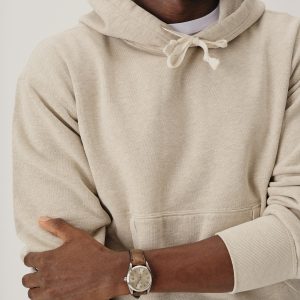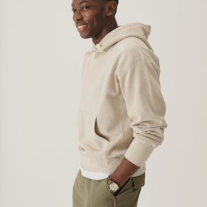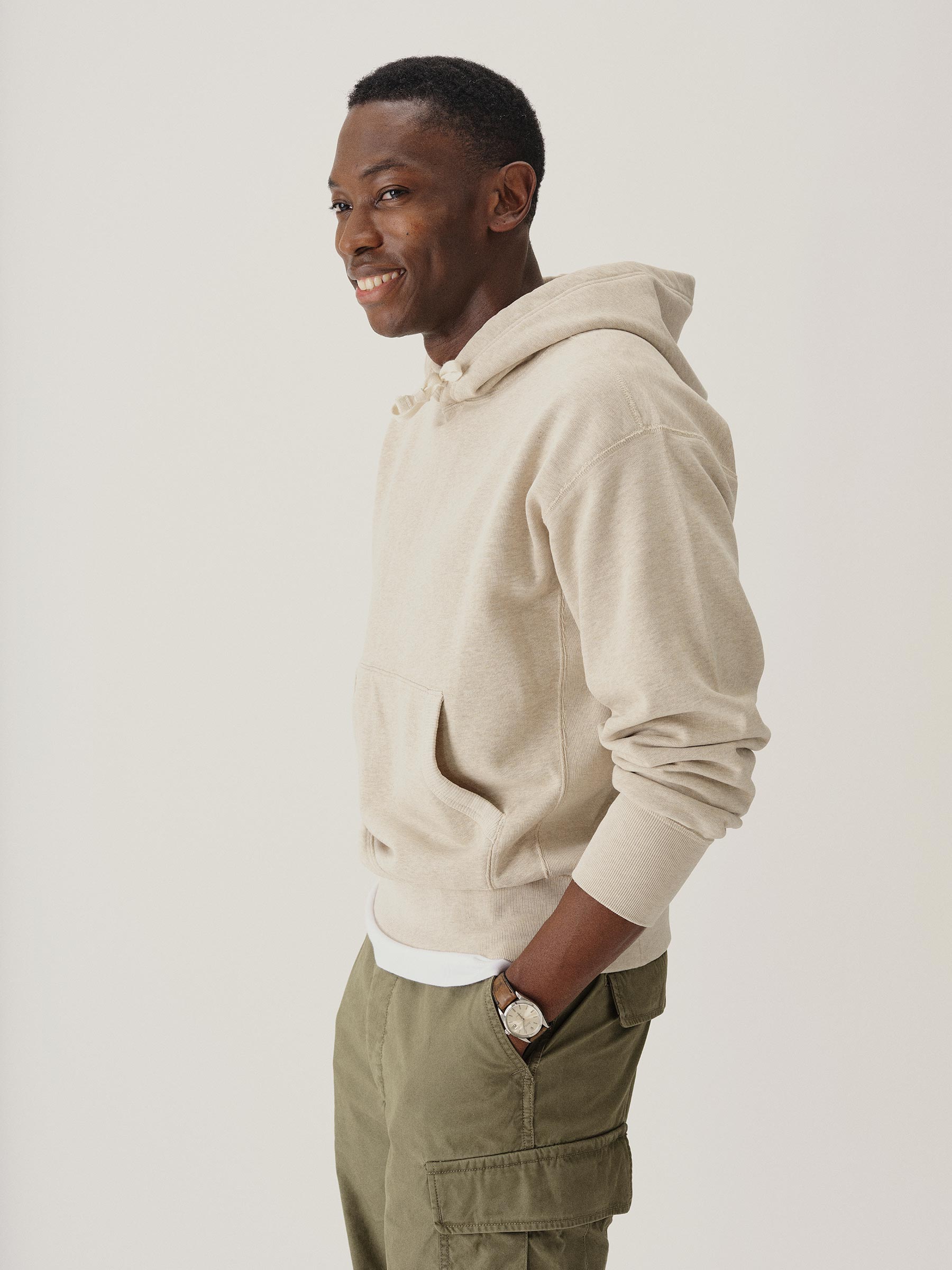 A midcentury-inspired hooded sweatshirt made from plush, not-too-heavy, not-too-light, welterweight French terry. Features a double-layer hood and kangaroo front pocket.